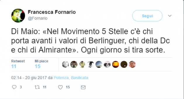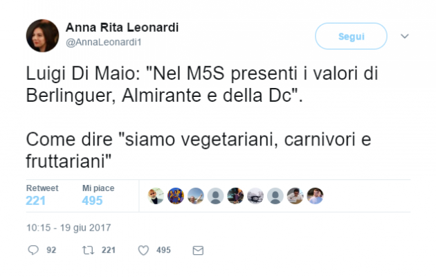 Luigi Di Maio lo aveva detto in un comizio a Fabriano per sostenere il candidato sindaco del M5s: “A questo ballottaggio non c’è destra né sinistra: i valori ognuno di voi se li porta dentro di sé, ricordando Berlinguer, Almirante o i leader della Dc. Qui non c’è da votare per la destra o per la sinistra ma per chi vuole prendersi un’opportunità per non deludervi”. Poi la sera, ospite del salotto televisivo di Bruno Vespa, ha definito così il M5s: “È un movimento post ideologico, ma porta con sé tante idee che erano state i cavalli di battaglia dei partiti di destra e di sinistra, valori che sono dentro ognuno di noi. C’è chi si rifà a quelli portati avanti da Berlinguer, chi a quelli di Almirante, chi a quelli della Dc“.