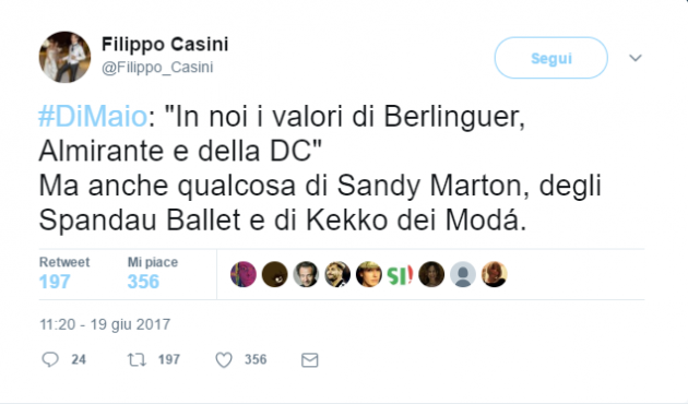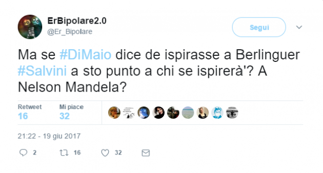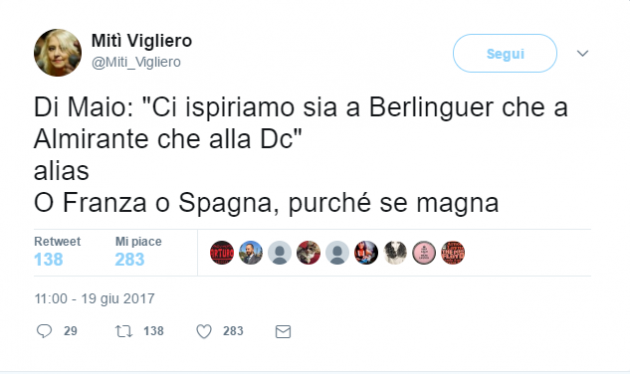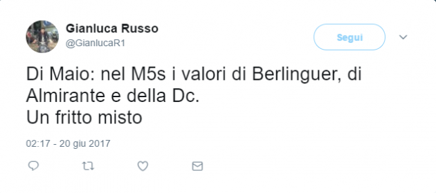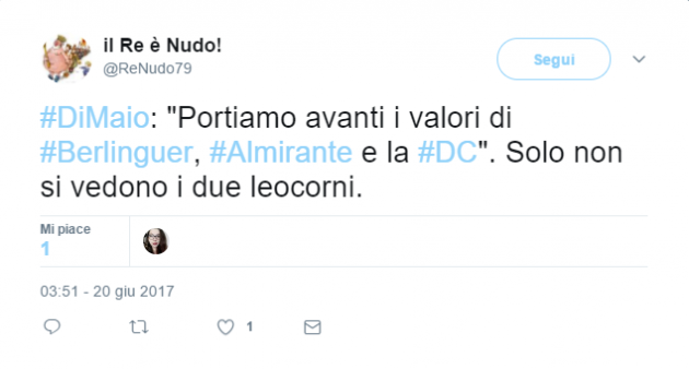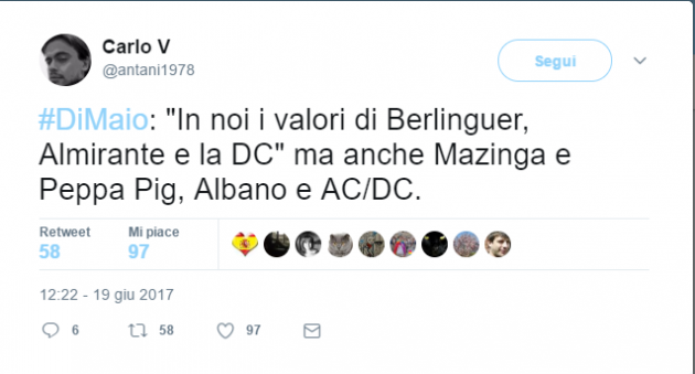 Enrico Berlinguer, Giorgio Almirante e la Democrazia Cristiana. Tutti padri ispiratori del Movimento 5 Stelle, secondo Luigi Di Maio in una dichiarazione a Porta a Porta. Un modo per ribadire che con i Cinquestelle si superano le ideologie del passato. Ma è un’esca troppo ghiotta per gli utenti del web, che su Twitter si sono scatenati in frecciatine ironiche contro il vicepresidente della Camera, capace di mettere insieme Movimento Sociale, democristiani e comunisti.