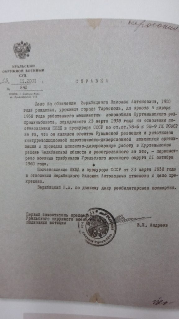 Un tappeto di boschi selvaggi riporta la rjabilitacija, il certificato di riabilitazione del bisnonno (Nikolaj Veržbickij). Lilin, scrivendo i testi di questo libro fotografico e autobiografico, ha inserito il documento, spacciandolo per una condanna a morte. Come se in Italia non ci fosse nessuno che mastica un po’ di russo. Intanto il bisnonno risulta nato a Tiraspol’, non in Siberia. Affronto la questione con lo zio di Lilin. Mi dice che il bisnonno, insieme al fratello, ha lavorato in una fabbrica vicino agli Urali, ed è stato fucilato come spia contro-rivoluzionaria rumena. Non era un criminale siberiano deportato in Moldavia, ma al contrario una delle tante vittime delle repressioni staliniane, ucciso perché aveva un cognome straniero e veniva dalla Moldavia. Non sapevano dell’esecuzione. Era normale per l’epoca. Speravano che fossero ancora vivi e li sono andati a cercare, quando c’è stato il disgelo dopo la morte di Stalin. Hanno avuto la riabilitazione, venendo così a sapere che fine avevano fatto.