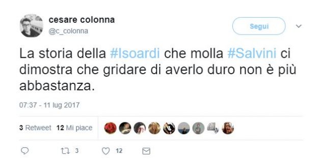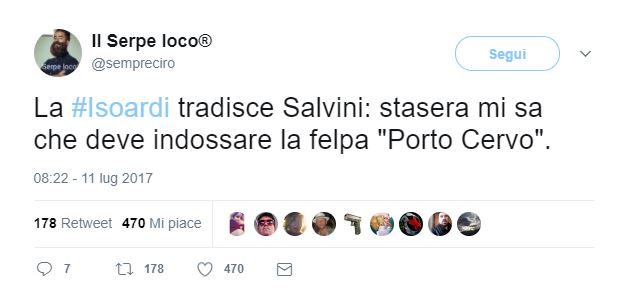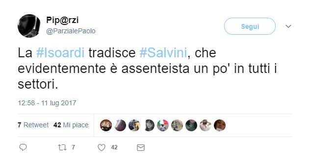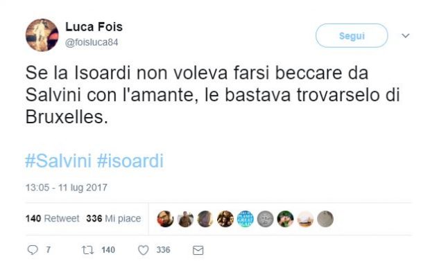 L’appassionato bacio a Ibiza tra Elisa Isoardi, fidanzata da un anno e mezzo con il leader della Lega Matteo Salvini, e l’avvocato romano Matteo (caso vuole) Placidi, immortalato da settimanale Chi, sta ormai spopolando nelle pagine rosa di tutti i giornali, riscuotendo l’attenzione del mondo patinato e non solo. Il tradimento – o presunto tale – della bella conduttrice, infatti, non è passato inosservato anche nel popolo dei social, Twitter su tutti, dove gli utenti si sono sbizzarriti, a suon di hashtag, in cinguettii sarcastici nei confronti del politico leghista. Dall’occhilino strizzato all’assenteismo – politico e non solo – di Salvini, all’ironia sulla coincidenza dei nomi, passando per la celebre foto delle corna di Bossi, in tanti aspettano la risposta del leader della Lega che, tuttavia, ancora stenta stranamente ad arrivare.