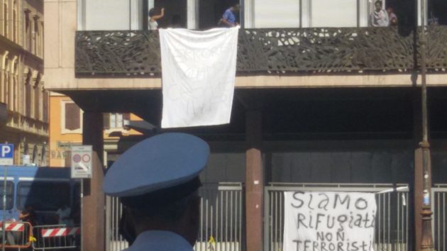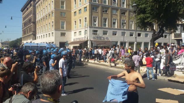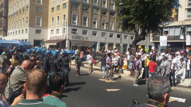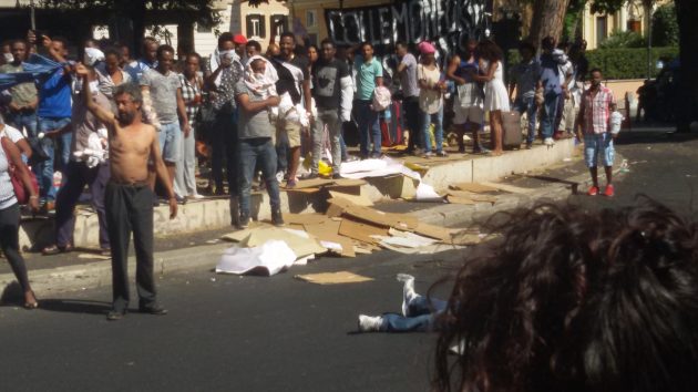 E’ ovvio come il protrarsi dell’accampamento al centro di piazza Indipendenza stia rischiando di diventare insostenibile, sia per i migranti sia per l’evidente stato di degrado e confusione in cui sta precipitando la zona. E’ per questo che in mattinata la Questura di Roma ha intensificato la presenza delle forze dell’ordine, nel tentativo di indurre gli ex occupanti a lasciare la piazza e disperdersi. Un’attività interpretata quasi come una minaccia dagli eritrei, i quali dopo un tentativo di mediazione hanno inscenato una protesta, fortunatamente non sfociata in scontri con la polizia, sebbene la tensione a un certo punto sia stata altissima. “Siamo rifugiati non siamo terroristi”, urlavano i migranti, spiegando che “non vogliamo dare fastidio a questa città, dateci solo un posto dove stare, ci accontentiamo di poco”. A un certo punto, sui davanzali dell’edificio che affaccia sulla piazza sono comparse anche alcune bombole del gas, poi ritirate quando gli animi si sono calmati.