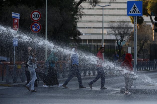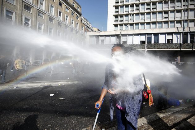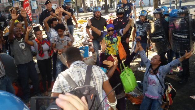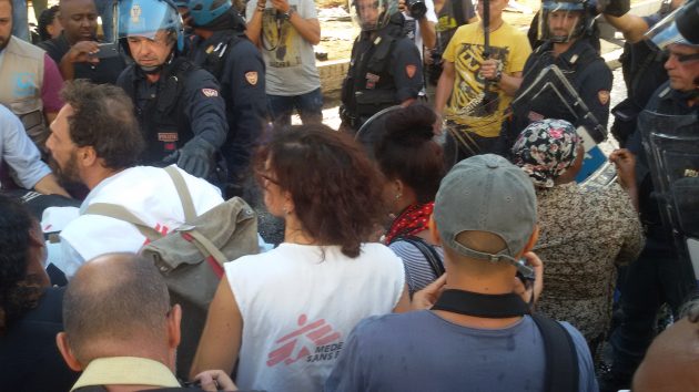 Le tensioni sono iniziate all’alba, quando le forze dell’ordine hanno sgomberato circa 100 rifugiati che dopo essere stati allontanati dal vicino palazzo di via Curtatone (occupato da 4 anni) si erano accampati nei giardini. La camionetta della polizia ha montato sul tetto un idrante che ha sparato acqua sulle persone sdraiate a terra. L’uso dell’idrante, secondo la Questura, ha evitato che venissero accesi fuochi e liquidi infiammabili visto che erano “pervenute informazioni di alto rischio, inerenti il possesso da parte degli occupanti di bombole di gas e bottiglie incendiarie”. La polizia ha riferito poi che i migranti hanno usato bombolette di gas e spray al peperoncino. Medici senza frontiere ha riferito di aver trattato in poche ore 13 persone, per la maggior parte donne. “Abbiamo chiamato le ambulanze per cinque persone ferite. Altri avevano fratture e lacerazioni causate dai metodi coercitivi utilizzati dalle forze dell’ordine”, racconta Francesco Di Donna, coordinatore medico di Msf, che era in piazza Indipendenza.