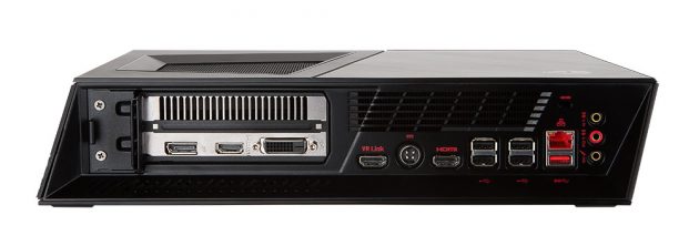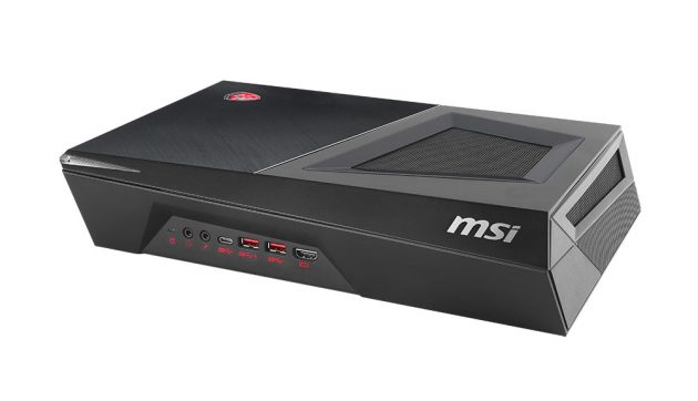 Il pc di MSI si presenta come anticipato con un design semplice, dalle formi simili ad un parallelepipedo con qualche sfaccettatura, non lontano da quello di altri dispositivi già presenti comunemente nei salotti, vedendo il pannello superiore caratterizzato dalla grande griglia per il raffreddamento della scheda video; nella parte anteriore trovano posto i jack per cuffia e microfono, una USB3.1 Tipo C, due USB3.1 Tipo A ed una porta HDMI dedicata al VR Link (simile a quanto visto sull’Aegis3). A tradire un po’ il suo DNA gaming la copertura dei led di stato che dal vertice superiore destro si dirama parzialmente sui tre spigoli che ad esso si congiungono ed il rosso usato per bordi e testi sulle porte frontali.