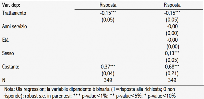 I tassi di risposta dei due gruppi sono significativamente diversi da un punto di vista statistico. Per il gruppo di trattamento, il tasso è stato del 15 per cento inferiore a quello del gruppo di controllo, mentre quello medio è stato del 30 per cento (tavola 1). Anche la velocità di risposta, definita come la percentuale di quelle pervenute entro 48 ore, è superiore nel campione di controllo di quasi 6 punti percentuali, coerentemente con la teoria economica standard: la gratuità della prestazione imposta dalla legge comporta una riduzione dell’offerta di lavoro e quindi un minore tasso di risposta nel gruppo trattamento.