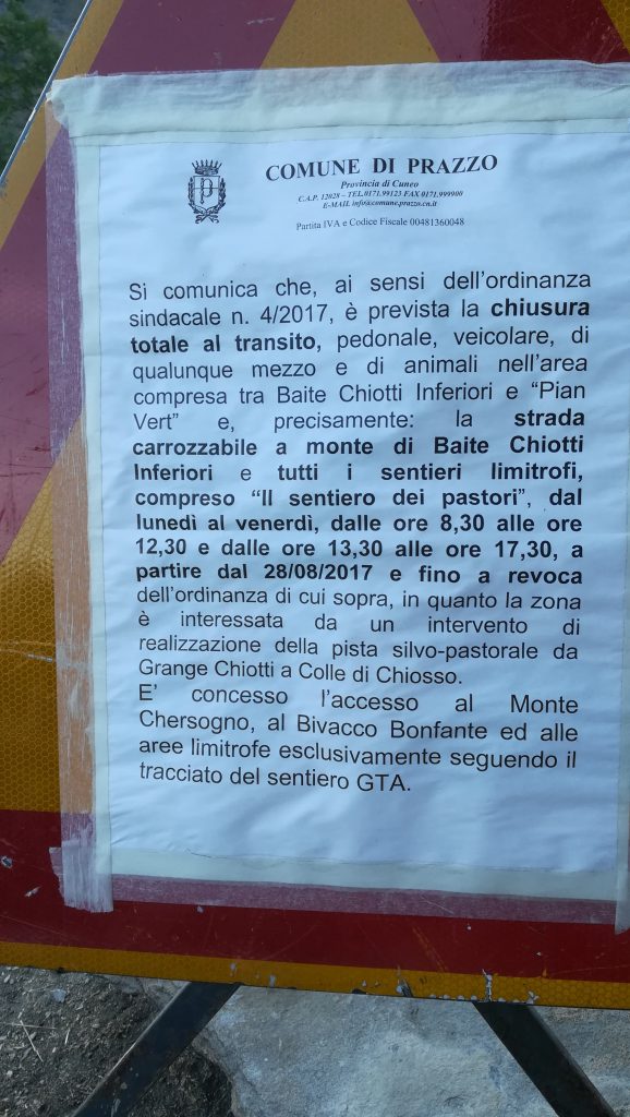 Mi è venuto da pensare a tutto questo quando un amico della Val Maira, in provincia di Cuneo, mi ha informato nelle scorse settimane dell’ennesima violenza che si sta perpetrando ai danni di quelle selvagge montagne. Una pista agrosilvopastorale, cioè una vera e propria strada percorribile da automezzi, nel comune di Prazzo, da Grange Chiotti al Colle di Chiosso.