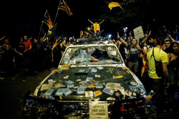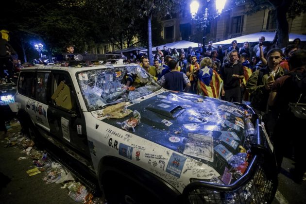Gli agenti della polizia spagnola sono rimasti “assediati” dai manifestanti fino alle 3 del mattino all’interno del palazzo dell’Economia catalano in Rambla de Catalunya. “Stasera ve ne andate senza macchine”, hanno gridato i dimostranti mettendo fuori uso i loro veicoli, bucando ruote e ricoprendo i vetri di adesivi. Solo grazie all’intervento dei Mossos d’Esquadra, i militari hanno potuto lasciare l’edificio. Quando è uscito il primo gruppo di agenti della Guardia civil, i Mossos hanno disperso i manifestanti con una carica in cui è stata ferita una persona. Poi la situazione si è tranquillizzata e non sono state necessarie altre cariche: l’ultimo gruppo della Guardia civil ha lasciato l’edificio intorno alle 7.15 di questa mattina. Il governo spagnolo ha noleggiato alcune navi al largo della costa catalana per far alloggiare i rinforzi della Guardia Civil e polizia nazionale inviati sul posto. Ma anche le navi da crociera – una a Barcellona e una a Tarragona – sono diventate oggetto di protesta. Il porto di Palamos, nel nord della Catalogna, ha negato l’autorizzazione di attracco a una terza nave, che è stata dirottata sulla capitale catalana. Mentre il sindacato degli scaricatori del porto di Barcellona ha reso noto che boicotterà le imbarcazioni noleggiate. Anche gli scaricatori di Tarragona hanno annunciato che non porteranno rifornimenti alla nave della polizia spagnola.