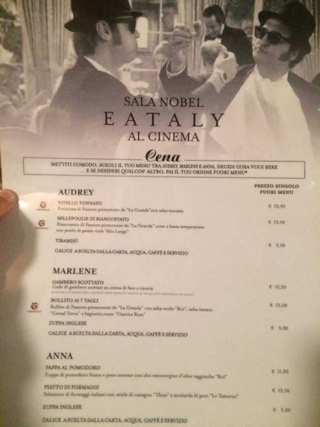 La sala Nobel è bellissima, piccolina, con soli 18 posti con poltrone stra-comode, tutte dotate di un tavolino girevole e una luce soffusa che si accende senza dar fastidio agli altri vicino a te. Quando entri una hostess davvero carina e discreta ti accoglie e ti spiega che nella prenotazione del biglietto è compresa la cena, organizzata da Eataly (che ha la sua sede milanese proprio attaccata all’Anteo), ti lascia un menù e ti fa scegliere tra tre combinazioni, con un antipasto, un secondo, un dolce, un bicchiere di vino e il caffè, mentre acqua e pane li trovi già di fianco al tavolino quando arrivi, insieme alle posate.