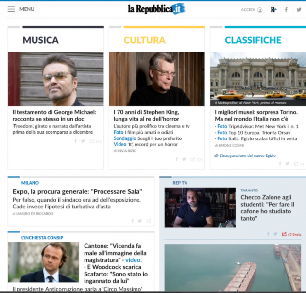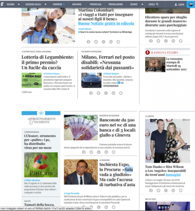 Diverso l’atteggiamento della stampa quando in una situazione simile si è trovato il sindaco di Milano, Giuseppe Sala. Il 19 settembre scorso la procura generale del capoluogo lombardo ha chiesto di processare il primo cittadino del Pd per falso ideologico e materiale. Sala, infatti, è indagato nell’inchiesta sull’appalto della Piastra dei servizi di Expo 2015, società di cui era amministratore delegato. La richiesta di rinvio a giudizio, invece, non comprende l’accusa di turbativa d’asta, che compariva nell’avviso di chiusura indagini: contestazione che è stata stralciata e va dunque probabilmente verso l’archiviazione. Eppure in quel caso Corriere.it che Repubblica.it pubblicano la relativa notizia in fondo alla loro homepage, sotto i box dedicati alla musica e alla cultura, e perfino con meno rilevanza rispetto a quella dedicata all’articolo sui 70 anni di Stephen King (è il caso del sito del quotidiano diretto da Mario Calabresi), o a un’intervista a Martina Colombari (sul sito di via Solferino). Stessa storia in televisione: il Tg1 dedica un servizio di due minuti e 24 secondi quando arriva la richiesta di processo per la Raggi, solo 21 i secondi dedicati a Sala.