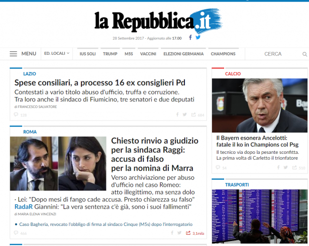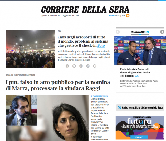 Apertura dei siti web da una parte, notizia pubblicata in fondo alle homepage dall’altra. È un doppio destino quello delle notizie giudiziarie su Giuseppe Sala e Virginia Raggi. Oggi per la sindaca di Roma è arrivata la richiesta di rinvio a giudizio. I pm della Capitale vorrebbero processarla con l’accusa di falso nell’ambito dell’inchiesta sul cosiddetto “pacchetto nomine”. Nel dettaglio il falso contestato è legato alla nomina di Renato Marra, fratello di Raffaele, alla direzione Turismo del Campidoglio. I magistrati romani, invece, hanno sollecitato l’archiviazione per il reato di abuso d’ufficio che invece riguardava la promozione di Salvatore Romeo a capo della segreteria politica. La richiesta di processare la sindaca del M5s, peraltro anticipata più volte nelle scorse settimana, occupa saldamente il primo piano dei due principali quotidiano nazionali, e cioè Corriere.it e Repubblica.it.