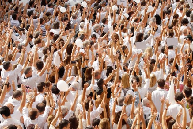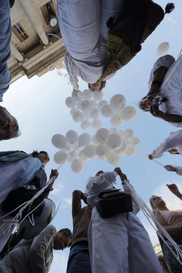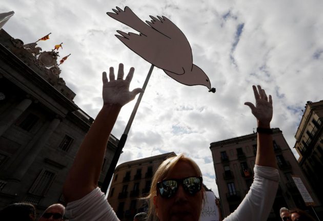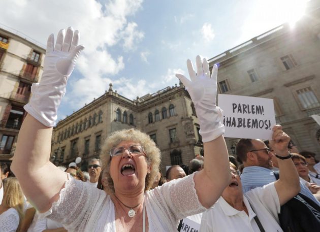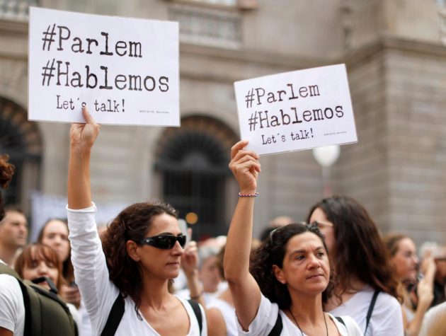 Centinaia di persone stanno manifestando a Valencia, vicino al municipio, per chiedere pace e dialogo in Catalogna e spingere i politici di dialogare e arrivare a una soluzione della crisi. La concentrazione rientra fra quelle convocate in tutto il Paese dal movimento spontaneo ‘Parlem?’, attraverso le reti social. I partecipanti sono vestiti di bianco e non hanno esposto alcuna bandiera, come chiesto nella convocazione. Hanno mostrato invece cartelli con scritte come ‘Se quelli sopra strillano, quelli in basso parlano’, e ‘Parliamo’.