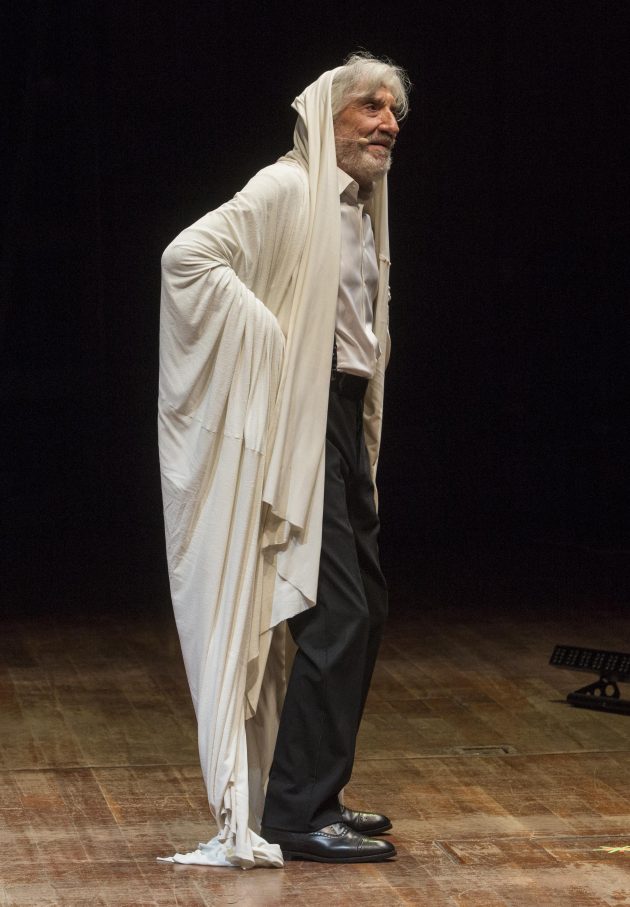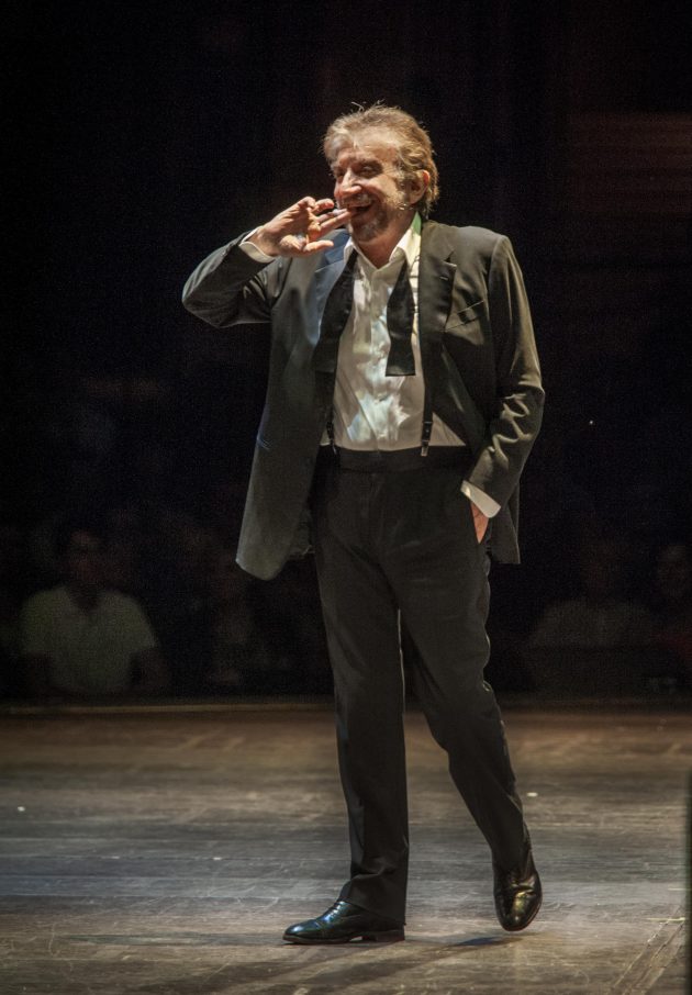 Così quello che ti aspetti come un monologo tutto per il pubblico diventa un vivace dialogo, un varietà. Anzi, un galoppante pezzo di avanspettacolo fatto di lazzi e numeri musicali dai quali fanno capolino Pietro Ammicca con il suo gioco mimico in combutta con gli spettatori e l’inossidabile parodia della Signora delle Camelie, dove un attore sordo e un po’ greve viene tirato in ballo su un palco in balia del suggeritore. Ma si pesca anche da più lontano. “Lo spettacolo è sempre quello, ma ogni sera Gigi cambia qualcosa”. Mi dice la sua assistente prima dello spettacolo. “Certe volte sostituisce un pezzo con un altro. I suoi cavalli di battaglia sono così tanti. Non sai mai cosa sceglierà”.