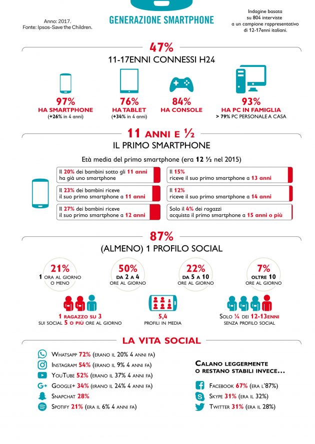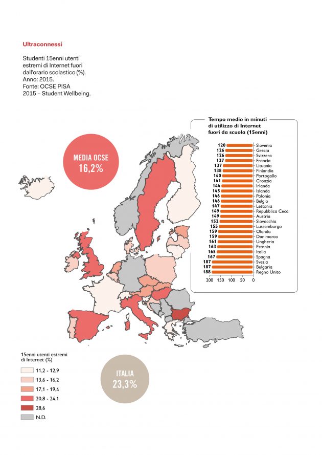 Si assiste poi a due tipi di fenomeni opposti. Con l’aggravarsi delle condizioni socio-economiche di molte famiglie, tanti bambini non hanno accesso ad attività culturali. Sei ragazzi su 10 (il 59,9%) tra i 6 e i 17 anni in un intero anno non arrivano a leggere almeno un libro, fare sport in modo continuativo, andare a concerti, spettacoli teatrali, visite a monumenti e siti archeologici, visite a mostre e musei e non hanno accesso a internet. Mentre i bambini in condizioni svantaggiate non accedono mai, in un anno, al web, c’è una folta schiera di ultraconnessi: in Italia quasi un 15enne su 4 (23,3%) risulta collegato a internet più di 6 ore al giorno, ben al di sopra della media Ocse ferma al 16,2%. L’età in cui un bambino riceve il primo smartphone è scesa a 11 anni e mezzo (erano 12 e mezzo nel 2015), l’87% dei 12-17enni ha almeno un profilo social e uno su 3 vi trascorre 5 o più ore al giorno.