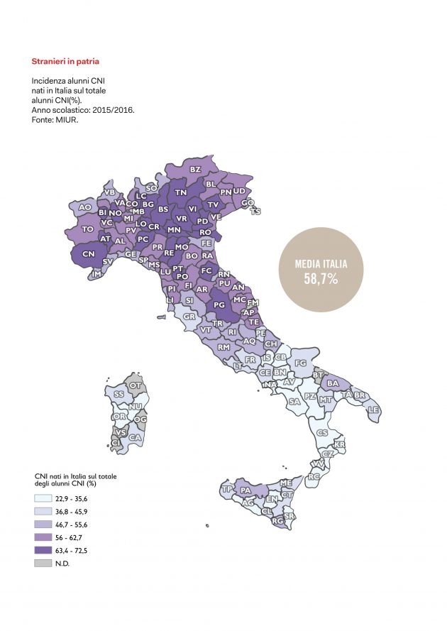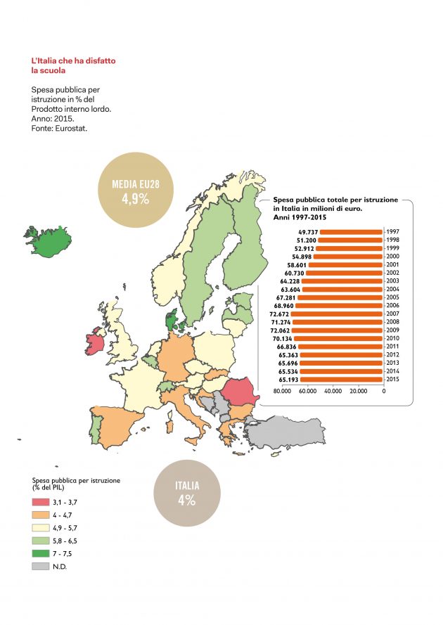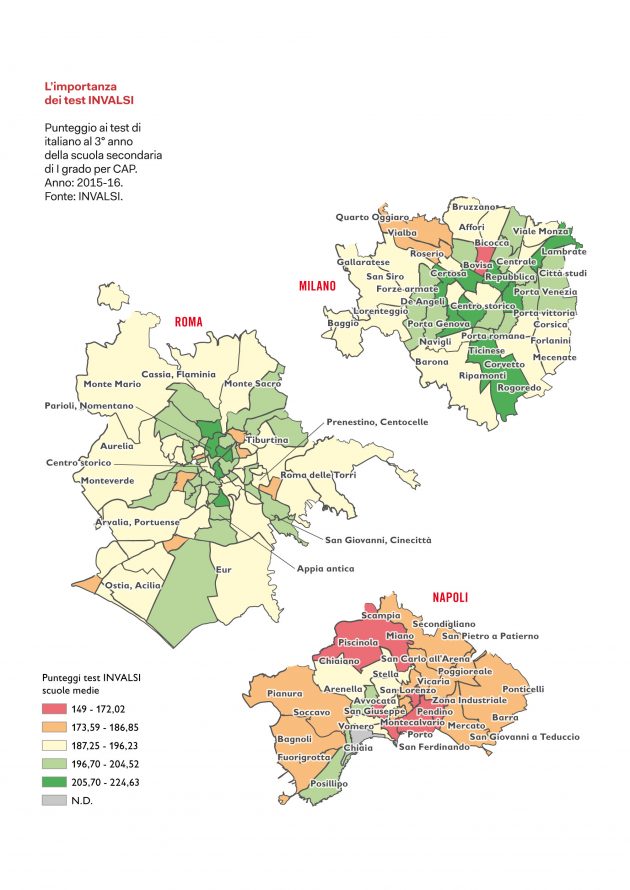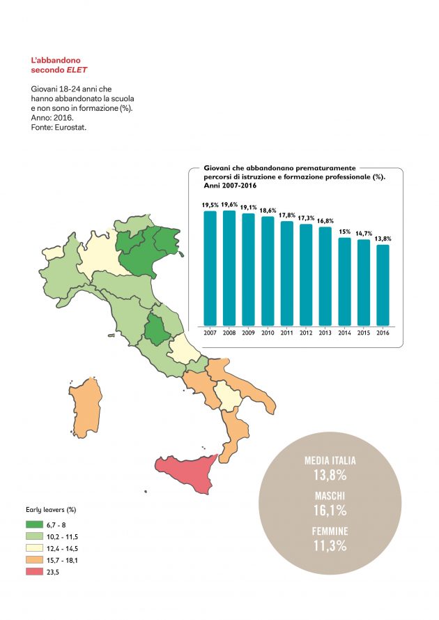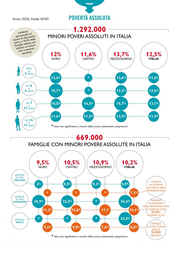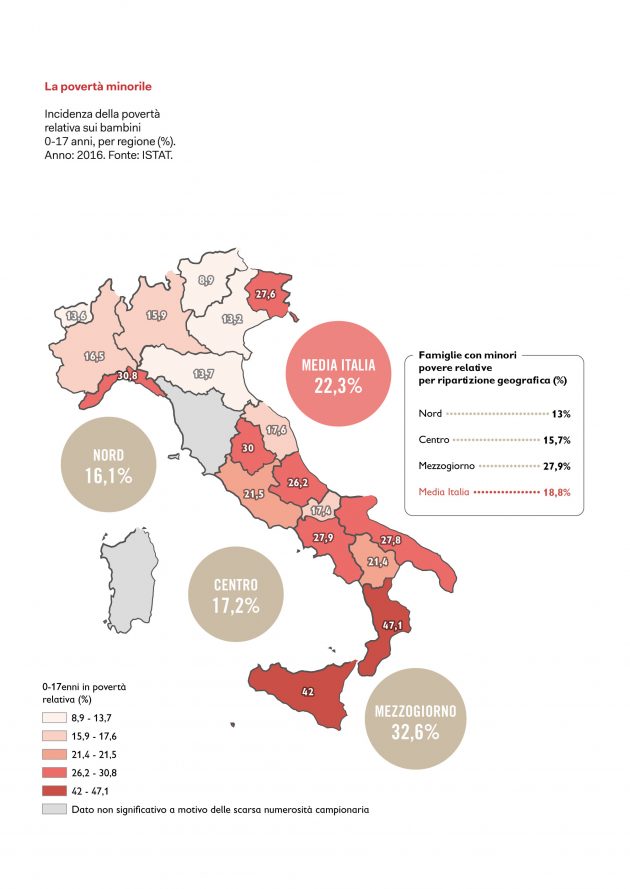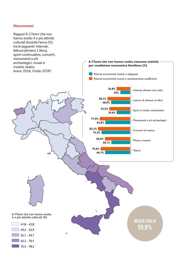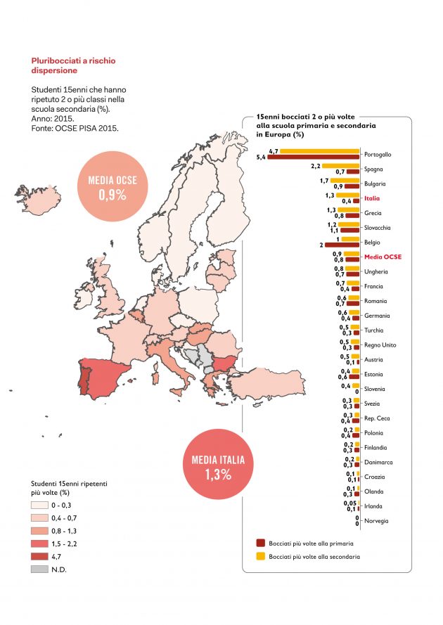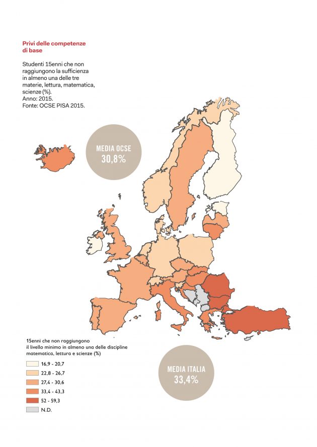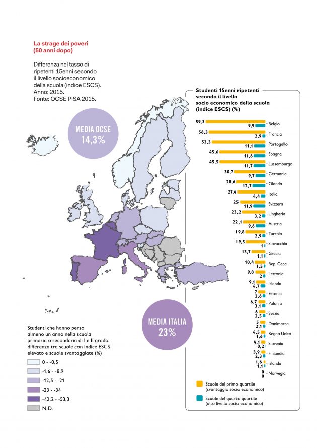 POVERTÀ, DISUGUAGLIANZA E RENDIMENTO – In Italia vivono 669.000 famiglie con minori in condizione di povertà assoluta che, una volta sostenuti i costi per la casa e per la spesa alimentare, possono spendere solo 40 euro per la cultura e 7.60 per l’istruzione al mese. È un fenomeno che investe tutto il paese: i bambini in tale situazione – 1.292.000, il 14% in più in un anno – rappresentano il 12,5% del totale dei minori (il 12% al Nord, l’11,6% al Centro, il 13,7% al Mezzogiorno). La correlazione tra la condizione socio-economica e il successo (o l’insuccesso) scolastico in Italia è più forte che altrove: nelle scuole che presentano un indice socio-economico basso l’incidenza di ripetenze rispetto alle scuole con un indice elevato è 23 punti percentuali maggiore, laddove la differenza media nei paesi Ocse è del 14,3%. Uno studente di 15 anni su 2 (il 47%) proveniente da un contesto svantaggiato, inoltre, non raggiunge il livello minimo di competenza in lettura, otto volte tanto rispetto a un coetaneo cresciuto in una famiglia agiata.