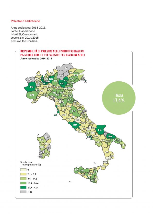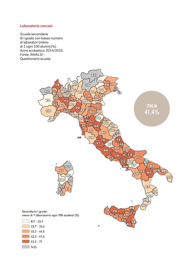 UNA SCUOLA (NON) A MISURA DI BAMBINO – Con solo il 4% del PIL nazionale speso nel settore dell’istruzione, contro una media europea superiore del 4,9%, non è facile per la scuola pubblica offrire una risposta alle problematiche che incontra. Così, ad esempio, il 41% delle scuole secondarie di I grado lamenta una scarsa dotazione di laboratori e ambienti di apprendimento adatti a sperimentare nuove prassi didattiche, con 4 scuole su 10 che possono fare affidamento su meno di un laboratorio ogni 100 studenti. Solo il 17,4% degli istituti (una scuola su 6) è dotato di almeno una palestra in ogni sede, mentre, sebbene quasi tutte abbiano una biblioteca, meno di 3 su 4 danno la possibilità di effettuare un servizio prestito e meno di un terzo del patrimonio librario risulta utilizzato. Evidente il divario tra Nord e Sud: se in Settentrione 2 biblioteche su 3 sono dotate di almeno 3mila volumi, in Meridione lo è solo una su 3.