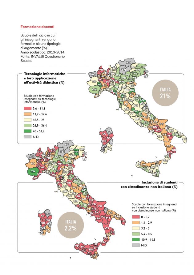 DALLA DENATALITÀ ALLA SFIDA DELL’INCLUSIONE – Tra i fenomeni che condizionano la scuola di oggi anche la denatalità: in cinquanta anni gli under 15 sono passati da 12 a 8 milioni, perdendo circa un terzo della popolazione in età della scuola dell’obbligo: l’Italia conta 165 anziani ogni 100 bambini sotto i 14 anni. Nonostante la tendenza fosse stata invertita dall’ingresso di molti bambini di origine straniera, negli anni scolastici dal 2015/2016 a quello in corso è stata registrata un’ulteriore contrazione di 100mila alunni. Nel caso in cui questo trend proseguisse, tra cinque anni ci saranno 361mila alunni in meno e tra dieci 774mila. Lo scenario somiglierebbe a quello che oggi già sperimentano da numerose aree interne: qui le scuole secondarie di primo grado sono presenti solo nel 60% dei comuni e quelle di secondo nel 20%. Sebbene il numero totale di alunni diminuisca, aumenta invece quello dei bambini di origine straniera, che rappresentano il 9,2% degli studenti; tra coloro che non hanno la cittadinanza italiana il 58,7% è nato nel nostro Paese. Di fronte alla sfida dell’inclusione, tuttavia, solo nel 2,2% delle scuole del primo ciclo gli insegnanti ricevono una formazione specifica.