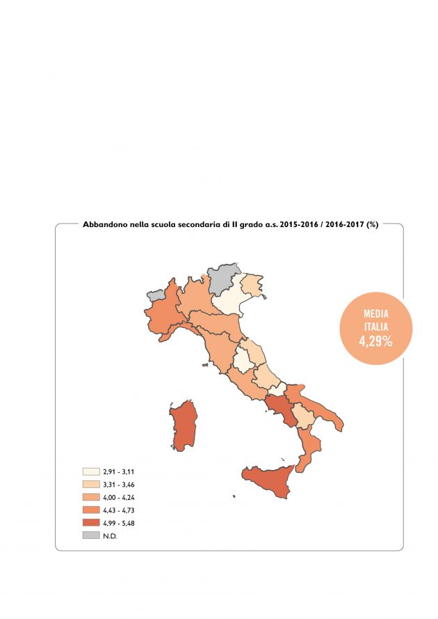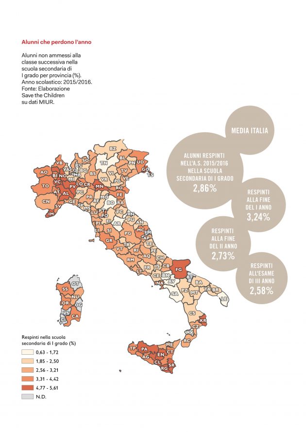 LA DISPERSIONE SCOLASTICA – Tra i bambini e i ragazzi che vivono in condizioni di disagio è ancora elevato il rischio di dispersione scolastica: nelle scuole secondarie di secondo grado il tasso di abbandono in un anno è stato del 4,3%, pari a 112mila adolescenti, mentre in quelle di primo grado il tasso scende all’1,35%, che corrisponde a 23mila alunni. “Sebbene negli ultimi decenni siano stati compiuti importanti passi in avanti nel contrasto alla dispersione scolastica – sottolinea Save The children – con una tendenza positiva che ha visto il tasso di abbandono abbassarsi progressivamente dal 2008 a oggi, il fenomeno della dispersione continua a rappresentare una delle principali sfide con cui la scuola italiana deve fare i conti, come mostrano i nuovi dati dell’anagrafe nazionale studenti del MIUR resi disponibili nell’Atlante”. Tra i ragazzi delle secondarie di II grado, possibilità superiori di abbandono sono registrate tra i maschi, in particolare tra coloro che vivono nelle regioni del Mezzogiorno, soprattutto in Campania e Sicilia e tra quelli con i genitori di origine straniera. Il divario non è solo tra Italia e Europa, ma anche tra Nord e Sud del territorio nazionale: nel Settentrione i 15enni in condizioni socio-economiche svantaggiate che non raggiungono le competenze minime nella lettura sono il 26,2%, cifra che sale al 44,2% nel Meridione.