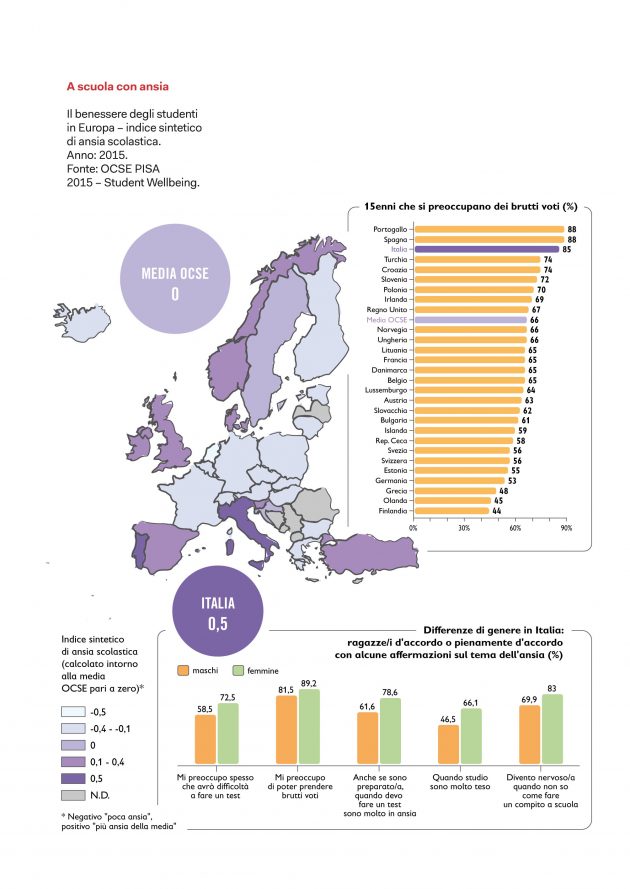MOTIVAZIONI E ANSIA SCOLASTICA – La crisi economica, inoltre, rischia di avere un effetto negativo anche sulla motivazione degli studenti. In Italia meno di un giovane laureato su 2 ha un lavoro (nell’Unione Europea il 71,4% di chi ha terminato l’università trova un’occupazione, in Italia appena il 44,2%, nel Mezzogiorno il 26,7%). Non sorprende, dunque, che gli ‘scoraggiati’ tra i 15 e i 34 anni, che hanno smesso di cercare un’occupazione, siano cresciuti del 43% in dieci anni, raggiungendo quota 420mila, 340mila di loro al Sud. La scuola italiana, poi, è vissuta con preoccupazione da molti alunni: il 56% studia con grande tensione, il 70% prova molta ansia prima di un test anche se preparato, il 77% si innervosisce se non riesce a eseguire un compito a scuola, l’85% teme di prendere brutti voti. Sentimenti che pongono il paese al primo posto, insieme al Portogallo, nell’indice elaborato dall’Ocse sull’ansia scolastica.