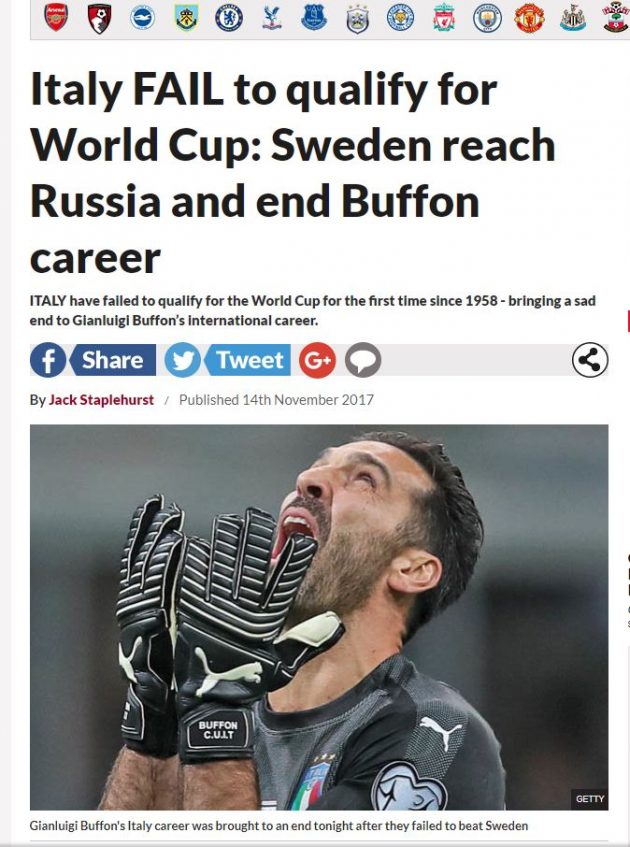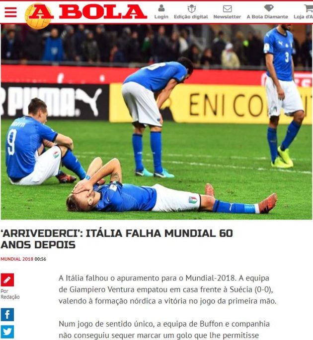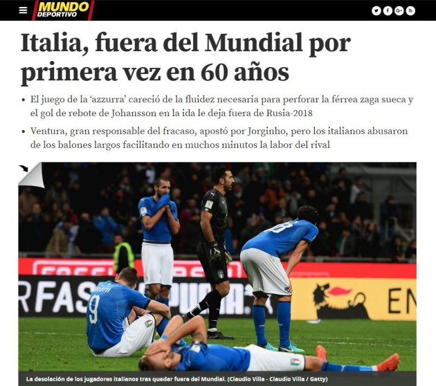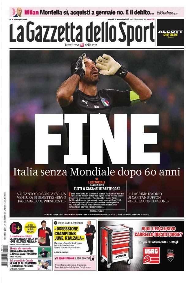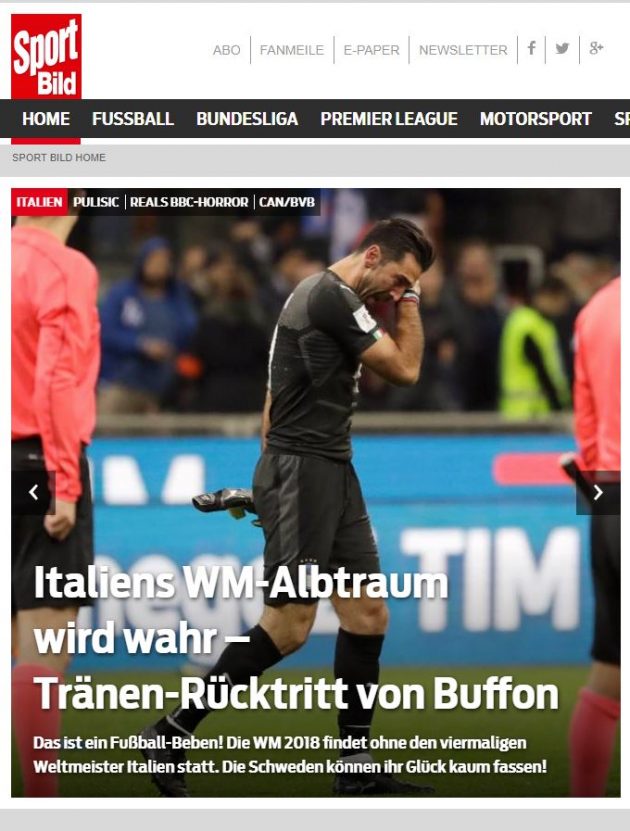 La nuova caporetto italiana finisce in prima pagina su tutti i principali quotidiani sportivi mondiali. Se per la Marca un mondiale senza Italia è “incredibile”, i francesi de L’Equipe giudicano la sconfitta “Un fiasco storico!”. Sconfitta che si prende anche l’apertura della sezione sportiva della Bild, il principale giornale tedesco: “Un terremoto. Peccato per il mondiale, ma meglio per noi”. Spazio anche all’ultima di Buffon, che ha salutato in lacrime la Nazionale dopo 175 presenze e una coppa del mondo. L’uscita dell’Italia arriva anche oltreoceano. “Un giorno tristissimo” è il titolo di Olé, sito argentino. Mentre in Svezia, il passaggio del turno è “Un miracolo a Milano“.
