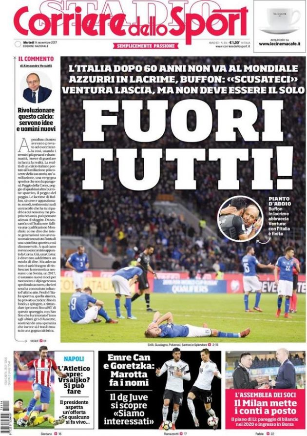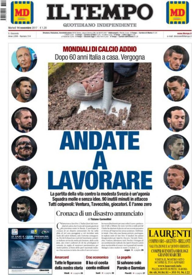 In Italia, l’eliminazione prende ovviamente tutte le prime pagine nazionali. Inequivocabile l’apertura del Tempo: “Andate a lavorare”, con la foto di una vanga sbattuta in prima pagina. Per la Gazzetta è la “Fine“. In caratteri cubitali.