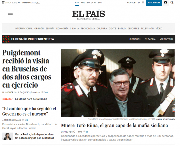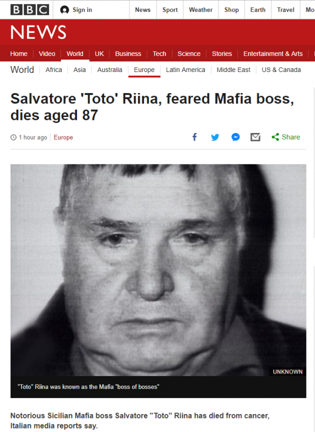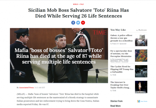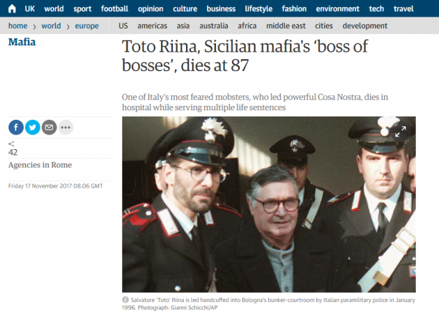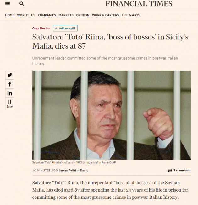 Anche il Fincial Times ha messo in homepage la morte del boss: “Salvatore ‘Toto’ Riina, ‘boss of bosses’ in Sicily’s Mafia, dies at 87”, “Salvatore ‘Totò’ Riina, il capo dei capi della mafia siciliana è morto ad 87 anni”. Il Time fa riferimento ai 26 ergastoli da scontare in regime di 41bis a cui è stato condannato Totò Riina. Il Wall Street Journal pubblica la notizia, evidenziando nel sottotitolo che Riina “stava scontando 26 ergastoli per condanne di omicidio”.