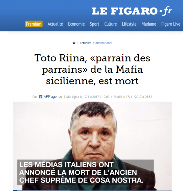 Il giornale radio del mattino di France Info, emittente pubblica francese, questa mattina ha dedicato alla morte del padrino di Corleone la prima notizia: “Cominciamo con la principale notizia della notte, arriva dall’Italia, l’ex padrino della mafia siciliana, Totò Riina, è morto” e, Oltralpe, la notizia era anche in testa ai titoli di Europe 1 e RTL.