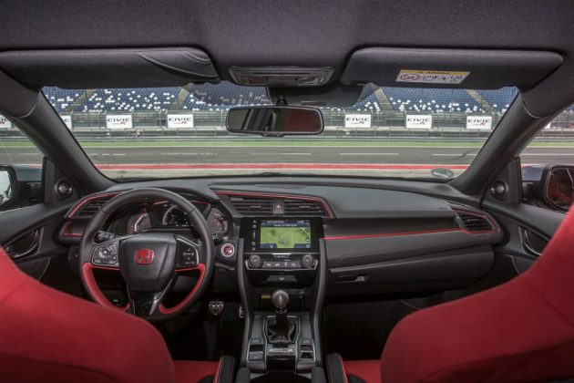 La cavalleria è trasferita a terra tramite un cambio manuale a 6 rapporti (manca l’opzione dell’automatico) che ricorda molto da vicino quello di una Mazda Mx-5: innesti corti e secchi e una piacevolezza di utilizzo fuori catalogo, eccezion fatta per la quinta marcia, talvolta più ostica da inserire. I rapporti più corti del 7% e il differenziale anteriore a slittamento limitato sono un toccasana per chi ama guidare: passare da una marcia all’altra è un piacere e il sistema Rev Match Control in scalata fa le doppiette al posto del guidatore per ottimizzare la fluidità e la velocità di cambiata. E la capacità di trazione della Civic Type R è notevolissima, anche nelle curve più strette affrontare a tutto gas in seconda marcia. Un mix di spinta e trazione che non fa rimpiangere la mancanza di una trasmissione 4×4. L’agilità è massimizzata dall’elettronica: lo stabilizzatore elettronico della Civic – che in Honda si chiama VSA (Vehicle Stability Assist) – prevede una sottofunzione che applica una leggera forza frenante alle ruote interne alla curva quando il volante è ruotato. Ciò si traduce in un “effetto perno” che migliora la reattività e la stabilità alle basse e alte velocità.