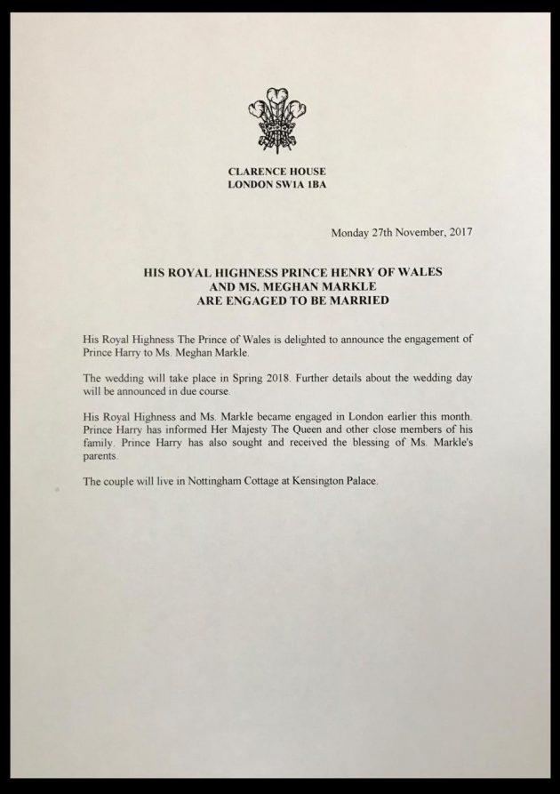 Nel breve scambio di battute con i reporter, carpito solo in parte dai microfoni, Harry si è detto “elettrizzato e al settimo cielo”. “Siamo anche contenti che non piova”, ha aggiunto con un battuta, guardando verso l’alto in una tipica giornata uggiosa londinese. Mentre Meghan s’è limitata a definire “molto” romantico il momento in cui lui si è dichiarato, ma ha invitato il principe a “lasciare per dopo” i dettagli. Probabilmente per la loro prima intervista di coppia, annunciata in serata.