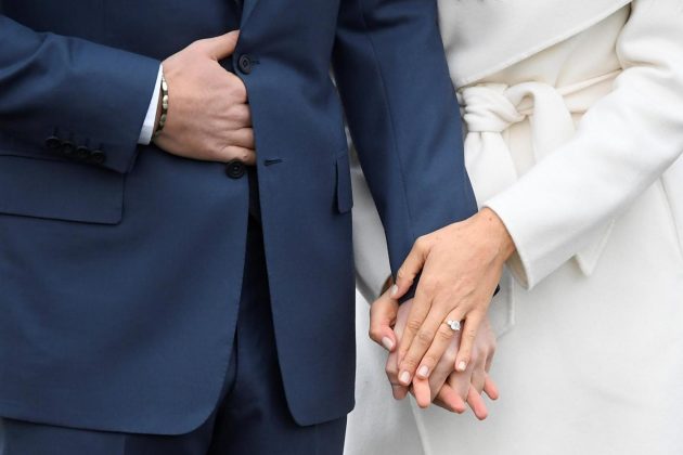 Eccoli raggianti i promessi sposi: il pricipe Harry e la divorziata Meghan. Che porta al dito un anello di fidanzamento disegnato direttamente dal principe con incastonati due diamanti laterali della collezione appartenuta a lady Diana e al centro un altro brillante originario del Botswana.