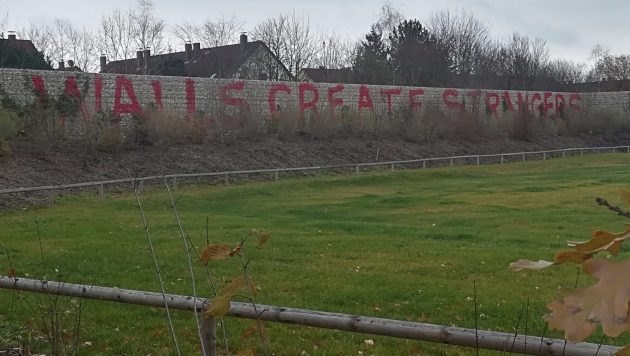 Su una cosa però non si può discutere: questo “non è un simbolo di Wilkommenkultur”, come ripete più volte una giovane mamma. Quella cultura dell’accoglienza che ora qui sentono quasi come un dovere: “I bambini che arrivano non dovranno mai giocare davanti a quel muro – continua – li voglio vedere il prima possibile nelle scuole e al parco giochi insieme ai miei figli”. Sul lato interno della barriera in rosso appare la scritta “Walls create Strangers”. I muri creano stranieri, “ma ormai questo c’è. Lo stiamo facendo coprire con la terra e con le piante per cercare di non farlo più percepire come tale”, racconta.