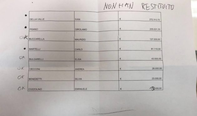 Ivan Della Valle: 270mila euro. Girolamo Pisano: 200mila euro. Maurizio Buccarella: 137mila euro. Carlo Martelli: 81mila euro. Elisa Bulgarelli: 43mila euro. Andrea Cecconi: 28mila euro. Silvia Benedetti: 23mila euro. Emanuele Cozzolino: 13mila euro. Luigi Di Maio, in diretta facebook, ha dato l’elenco dei nomi di chi il Movimento ha verificato avrebbe mentito sui rimborsi: “Queste persone si autoescludono per noi dal Movimento”, ha detto. “Abbiamo individuato un margine di errore del 2 per cento tra quanto versato e quanto dichiarato”. Mancano alcune persone, sulle quali si esprimeranno i probiviri. E non si accenna a Giulia Sarti e Barbara Lezzi, che invece sono state messe sotto accusa da le Iene.