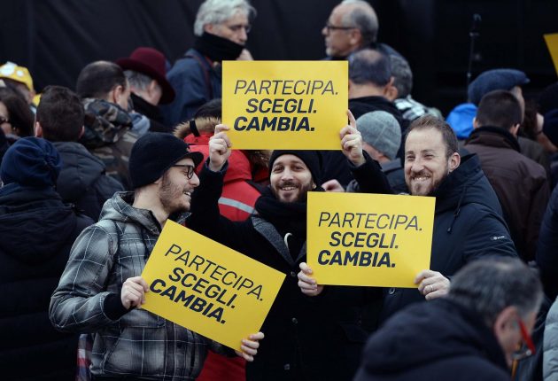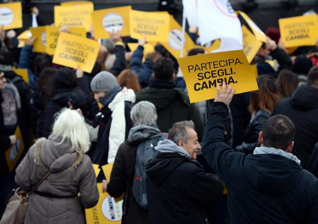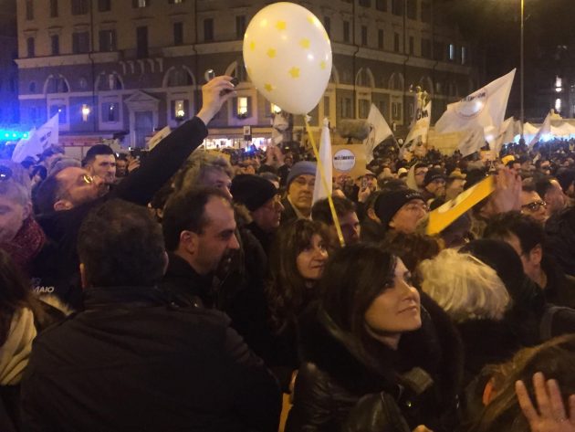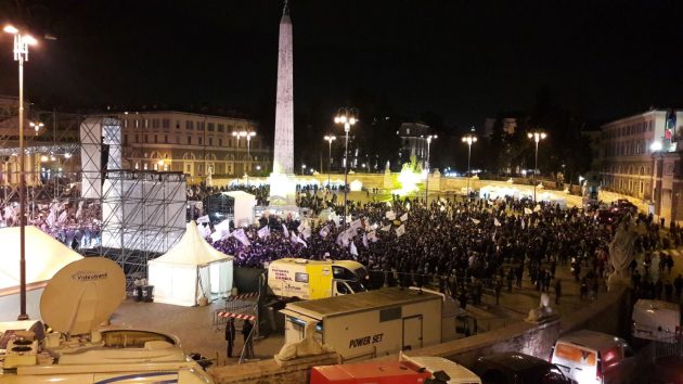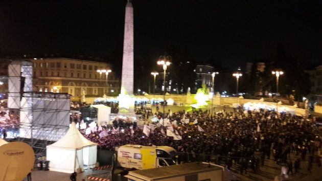 Beppe Grillo che apre con Virginia Raggi sotto braccio e chiude, ormai come da tradizione, con la sua canzone. Luigi Di Maio che legge una lettera alla “sua generazione” (quella del “nonostante tutto”) e annuncia il primo decreto del governo M5s: taglio ai vitalizi, agli stipendi dei parlamentari e redistribuzione degli sprechi a famiglie e pensionati. Poi Alessandro Di Battista che si congeda da deputato e promette resterà un attivista e Roberto Fico che parla ai militanti storici. E naturalmente Davide Casaleggio, il figlio di Gianroberto, che ha preso il testimone del padre e soprattutto lanciato la nuova fase del Movimento. La piazza che chiude la campagna elettorale 2018 del Movimento 5 stelle è il simbolo della fine di un’epoca, ma anche la benedizione per l’ultimo sprint della lunga corsa per l’impresa che sognano da sempre. In piazza del Popolo a Roma, riempita a metà, arrivano, secondo lo staff, 20mila persone: la scenografia è gialla, con i cartelli dalle scritte “Scegli, partecipa, cambia” e le bandiere bianche con il simbolo del Movimento. Poi i cori “onestà, onestà”, come da tradizione. Sul palco intervengono anche Roberta Lombardi, candidata presenidente per il Lazio, Dario Violi (ha mandato un videomessaggio) in corsa per le Lombardia, Roberto Fico e Paola Taverna. La folla non è quella del 2013, ma i tempi sono diversi: c’è meno bisogno di contarsi e di riempire le piazze (lo dice pure Grillo al microfono “Forse tornerà il tempo delle piazze”), ma tutti sperano in grande. “Ho visto i sondaggi, siamo a un passo dalla vittoria”, dice Di Maio. “Nel 2013 siamo entrati in Parlamento da opposizione, stasera quell’era finisce, inizia quella del governo”. Ma il vero annuncio è il primo atto che vorrebbe realizzare da presidente del Consiglio: “Un decreto in tre punti: al primo dimezzeremo lo stipendio ai parlamentari della Repubblica, al secondo togliamo i vitalizi e al terzo disponiamo 30 miliardi di sprechi verso aiuti alle famiglie e ai pensionati. Questo decreto potrà essere approvato dal Cdm che ieri vi ho presentato se domenica ci darete la maggioranza”. Solo ieri ha dato la sua lista di eventuali ministri per un esecutivo a 5 stelle e oggi aggiunge che “sta pensando” a Elisabetta Trenta, già indicata come ipotetico ministro della Difesa, per l’incarico di vice premier. Quando il comizio finisce il palco si riempie di tutti, candidati e uscenti, i portavoce 5 stelle presenti: è una delle scene tradizionali, salvo che si commuovono più del solito. Perché questa, come ha detto Virginia Raggi, è l’ “ultima chance per arrivare al governo”.