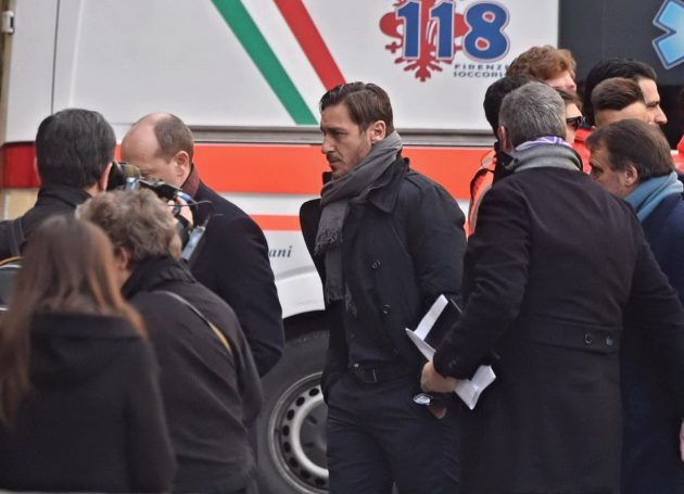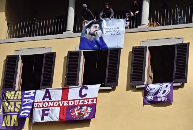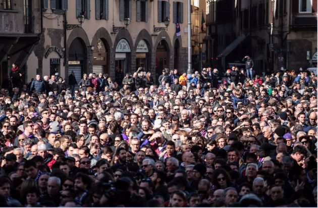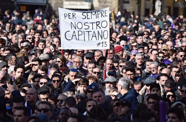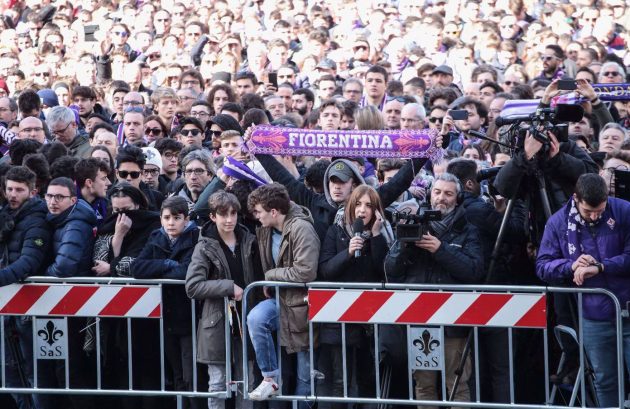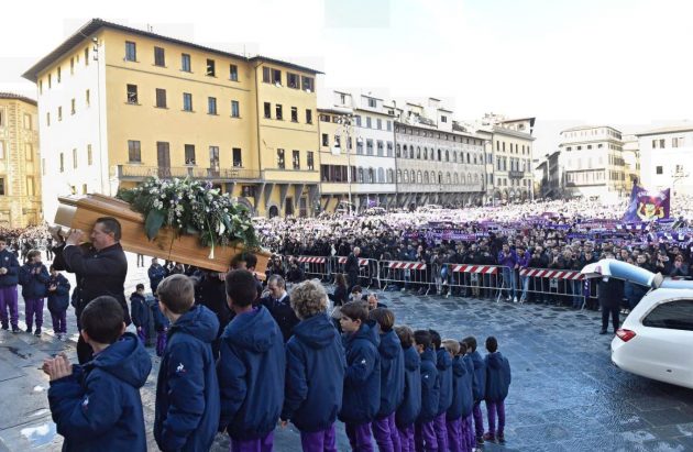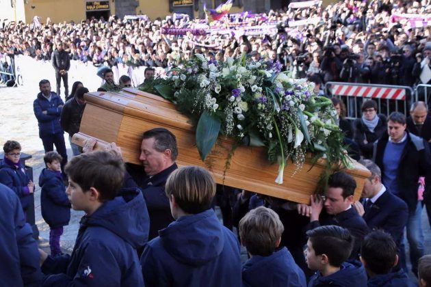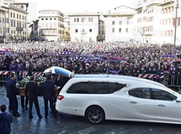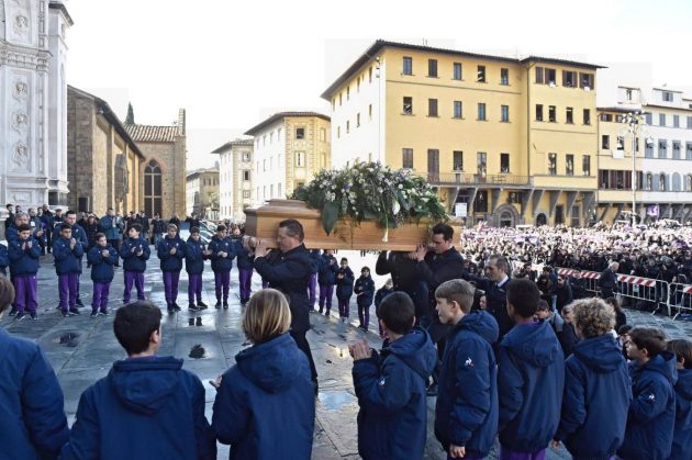 Il carro funebre si è fermato davanti alla chiesa e l’ingresso della bara è stato accompagnato da un composto silenzio che è durato più di tre minuti. Nel frattempo sventolavano le bandiere viola e centinaia di tifosi hanno disteso in alto le sciarpe coi colori sociali del club. All’uscita, il feretro è stato accolto con il coro “un capitano, c’è solo un capitano” e da applausi scroscianti di tutti i presenti.