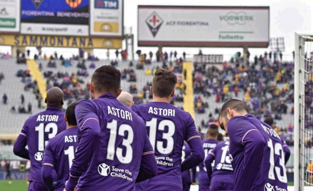 Un grande striscione bianco al centro del campo con una riproduzione della maglia numero 13 di Davide Astori e la scritta “Capitano per sempre”. Un lungo striscione in curva Fiesole che recita: “Ci sono uomini che non muoiono mai … Ci sono storie che verranno tramandate in eterno… Buon viaggio capitano“. Una coreografia che coinvolge tutto lo stadio, con palloncini bianchi e viola che si alzano al cielo e bandierine viola in Fiesole e Ferrovia. E tutti i giocatori della Viola con la sua maglia.