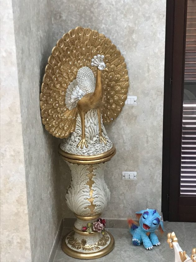 Tigri, leoni e pavoni di ceramica a grandezza naturale, maniglie dorate, pomelli di cristallo Swarovski e porta asciugamani costellati di pietre luccicanti. Sono alcuni dei particolari che si sono trovati davanti gli uomini della Dda di Napoli una volta entrati nell’abitazione del boss. Nella grande casa sviluppata su più piani c’è anche spazio per una cappella dedicata alla Madonna dell’Arco, alla quale sono particolarmente devoti i napoletani, con l’immagine chiaramente in cornice d’orata. Le foto sono agli atti di una inchiesta del pm della Dda di Napoli Mariella Di Mauro.