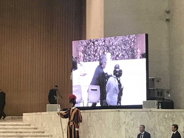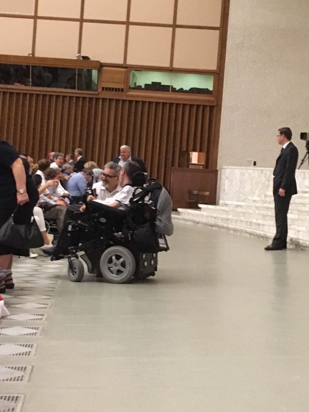 “Papa Francesco ci ha trasmesso molta energia” – Tanti i disabili che hanno affrontato insieme a parenti, amici o volontari, il viaggio per essere presenti. La macchina dell’organizzazione è iniziata circa 10 mesi fa, spiega Francesco Grauso responsabile ufficio fundraising e marketing dell’associazione, quando è arrivata la comunicazione ufficiale dell’incontro con Papa. Hanno partecipato al lavoro di organizzazione 30 volontari del Servizio Civile della Uildm Lazio, quelli della Croce Rossa di Roma e gli operatori del Centro clinico Nemo della Capitale. “Lo sguardo scambiato con Papa Francesco e l’avergli baciato la mano non lo dimenticherò mai. E’ stato importante sottolineare e condividere l’urgenza di abbattere le barriere architettoniche e sostenere una piena inclusione sociale delle persone con disabilità”, racconta a ilfattoquotidiano.it Anna Mannara, consigliere della Direzione nazionale Uildm con distrofia muscolare e direttrice editoriale di DM, giornale dell’organizzazione. “Ho vissuto un momento straordinario come cattolica, ma ritengo che sia stata una occasione speciale a prescindere dal credo religioso, perché Francesco ci ha trasmesso un’energia fortissima che ci servirà per la fase di progettazione del nuovo anno associativo dopo la fine dell’estate”. Per l’occasione, a nome dell’Unione italiana lotta alla distrofia muscolare, alcuni bambini, i gemellini Andrei e Ionut di 6 anni della sezione Uildm di Como e Mario, 5 anni della sezione di Arzano (provincia di Napoli) hanno consegnato al Santo Padre tre doni: una farfalla d’argento, che rappresenta la volontà dei soci dell’associazione di non farsi fermare dalla distrofia muscolare, una pergamena e il gonfalone dell’organizzazione.