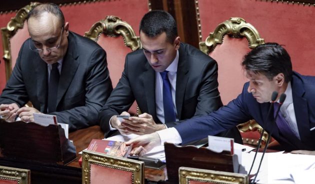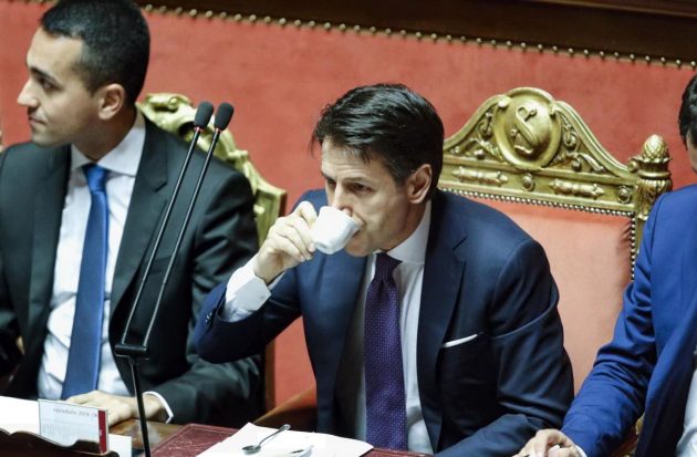Sembrano quasi sbalorditi quelli di prima mentre guardano quelli del cambiamento: non solo i senatori della maggioranza, non solo i ministri, ma anche il presidente del Consiglio Giuseppe Conte sta applaudendo il discorso che lui stesso ha appena finito di pronunciare. Un training autogeno, un incoraggiamento prima di affrontare una strada così in pendenza, un’espressione di spirito di comunità (“una squadra di governo”, un “progetto per il cambiamento dell’Italia”) che può essere un antidoto per chi si trova addosso la tensione, l’emozione della prima volta: il professore diventato capo del governo, ma anche i due giovani leader che lo hanno voluto lì, in mezzo all’Aula del Senato, a scandire quelle parole in diretta televisiva. Uno è alla sua destra, Luigi Di Maio – gesti misurati, quasi studiati, solo sguardi d’intesa -, l’altro alla sua sinistra, Matteo Salvini – più sciolto, lo sfoglio dei fascicoli, un tweet per chiamare in soccorso altro sostegno: “Bella squadra”. Sono loro, Di Maio e Salvini, che sembrano voler rassicurare il presidente: lui beve un ultimo caffè, una battuta, ridono tutt’e tre, Salvini gli dà una pacca di sostegno. La presidente Casellati dà la parola, Conte si leva in piedi, si abbottona la giacca, butta lì un colpo di tosse per schiarirsi la voce e parla quanto pochissimi hanno parlato dentro al Senato, forse nessuno: un’ora, 11 minuti e 13 secondi. Assicura umiltà, determinazione, passione, abnegazione, ma confessa di avvertire “pesante la responsabilità” da quando per la prima volta è entrato in quell’Aula cioè pochi secondi prima. Un discorso che pare lunghissimo e in realtà è di poco più ampio di quello che fece – le mani in tasca – il suo predecessore Matteo Renzi. E’ lunghissimo perché il copione è il contratto di governo (“che anche io ho condiviso sia pure in forma discreta”), un canovaccio seguito in modo pedissequo, fin troppo, fino al dettaglio, fino ad accorgersi di dover procedere a salti per accelerare verso il finale.