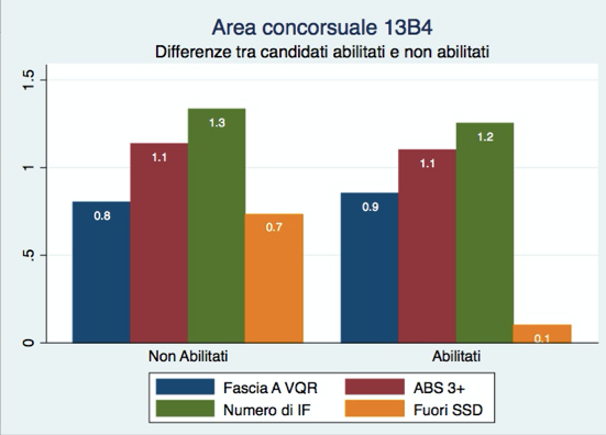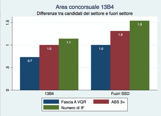 La figura 3 mostra che non esistono differenze nella produzione scientifica di area tra chi è incardinato nel settore 13B4 e chi invece proviene dall’esterno. Di nuovo, sembra che il principale criterio utilizzato per concedere l’abilitazione non sia stato il merito scientifico, ma l’appartenenza al medesimo settore, suggerendo l’esistenza di una deliberata volontà protezionistica volta all’esclusione dalle future selezioni nei concorsi locali i candidati provenienti dall’estero o da altri settori.