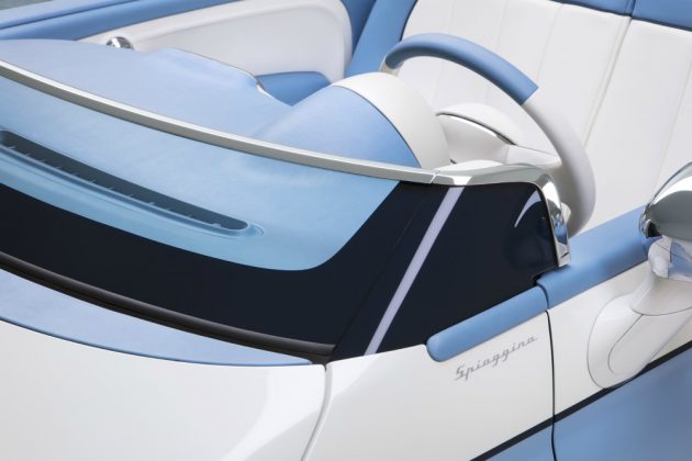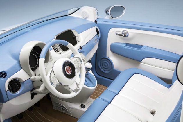 I due sedili anteriori sono stati sostituiti da una panchetta creata su misura, con rivestimenti in pelle impermeabilizzata Foglizzo Leather bianca e azzurra. Il tocco vintage è garantito pure dai pneumatici con spalla bianca e dalle finiture cromate di maniglie, specchietti e delle borchie dei cerchi in lega. La Spiaggina by Garage Italia è già prenotabile (anche tramite i concessionari Fiat) e personalizzabile. I motori sono gli stessi attualmente disponibili nella gamma 500.