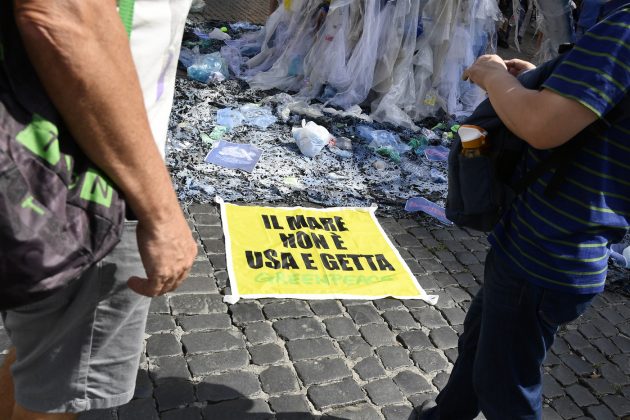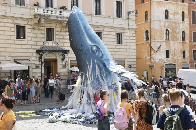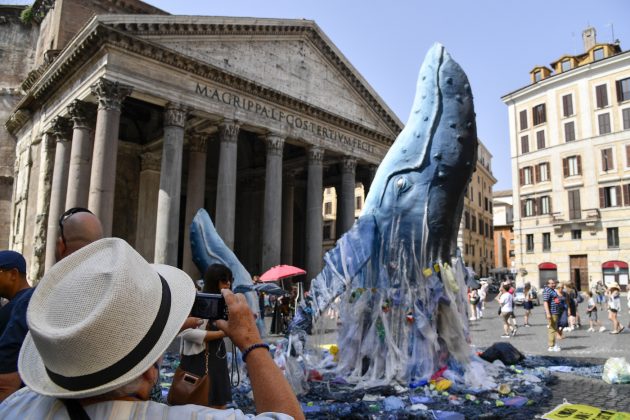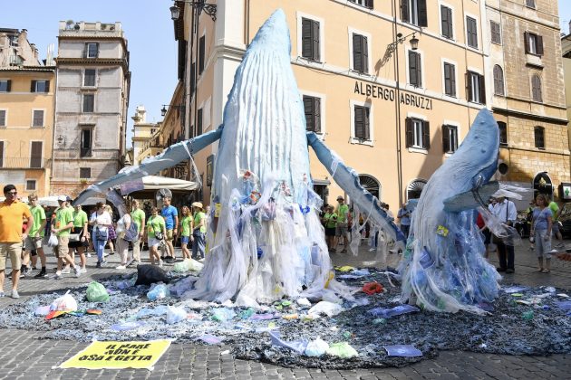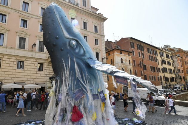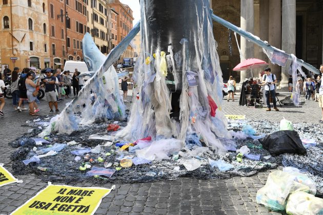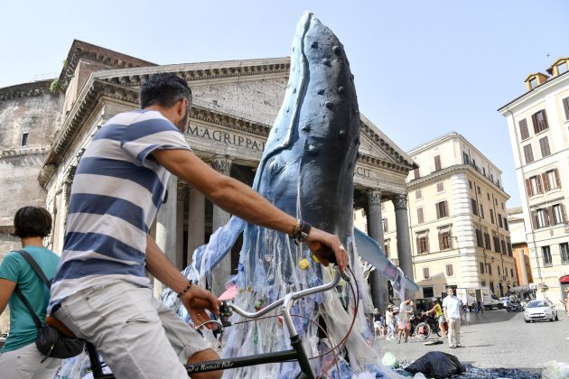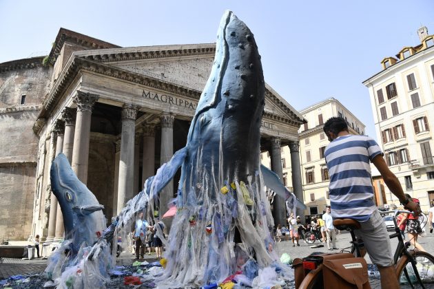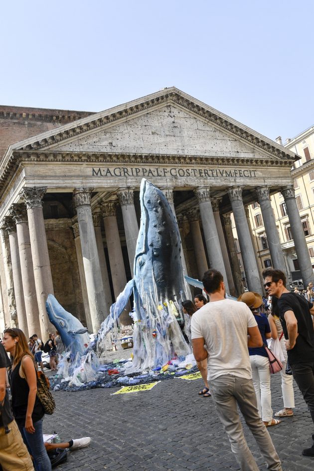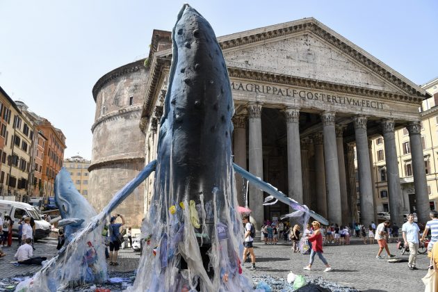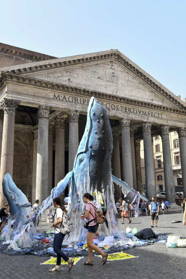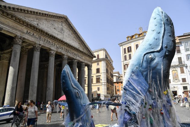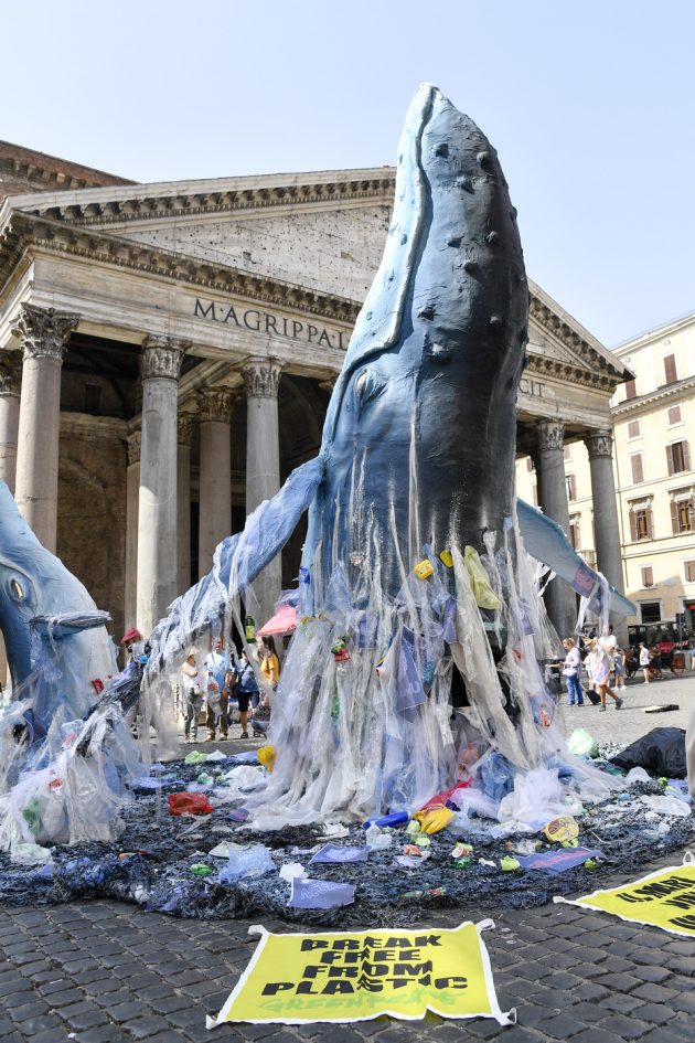 Balene che nuotano in un oceano di plastica e rifiuti: Roma si sveglia ecologista con la nuova campagna di Greenpeace contro la plastica nei mari, di fronte al Pantheon l’associazione ha posto la ricostruzione di due balene composte da plastica a grandezza naturale avvolte in un oceano di rifiuti. Assieme ai cetacei il messaggio “Il mare non è usa e getta”. Greenpeace porta così una dimostrazione concreta ed esemplare dei danni della plastica, un messaggio di sensibilizzazione per tutti sui pericoli che la plastica arreca quotidianamente nelle acque del mare e per gli esseri viventi che ci vivono, una campagna storica dell’organizzazione ambientalista. “Nella lotta intrapresa all’uso della plastica, istituzioni, cittadini e aziende devono fare fronte comune” dichiara il ministro dell’Ambiente Sergio Costa. “Noi faremo la nostra parte lavorando per vietarne l’uso negli uffici pubblici – spiega il ministro – Occorre però un coinvolgimento più ampio, con campagne di sensibilizzazione rivolte ai singoli cittadini, affinché ognuno comprenda quanto prezioso può essere il contributo derivante dalle piccole azioni quotidiane. E serve coinvolgere maggiormente anche le imprese che devono diventare i nostri primi alleati nel passaggio, sempre più necessario, a un modello di economia circolare”.