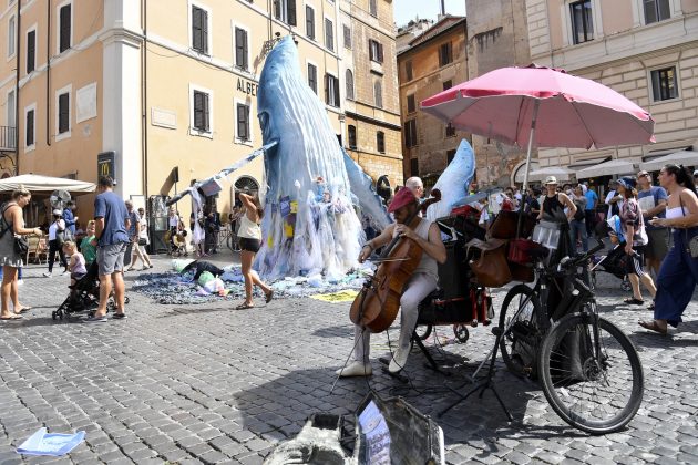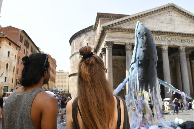 Roma, al Pantheon due balene ricoperte di plastica: l’azione di Greenpeace. “E’ rifiuto più presente sulle spiagge italiane”