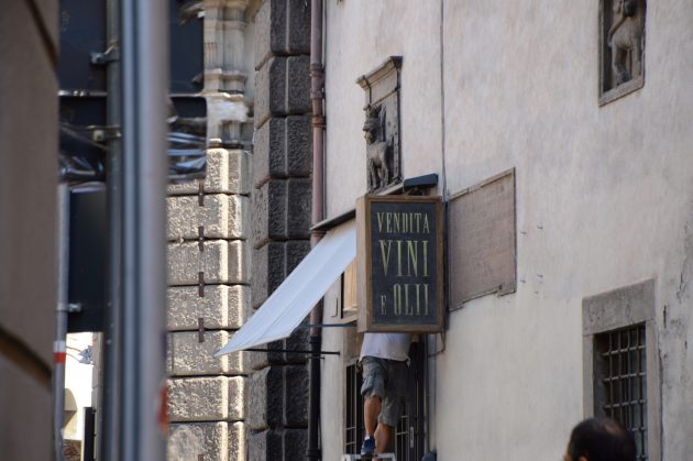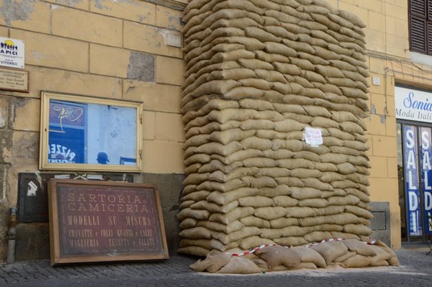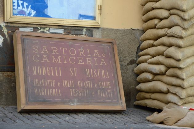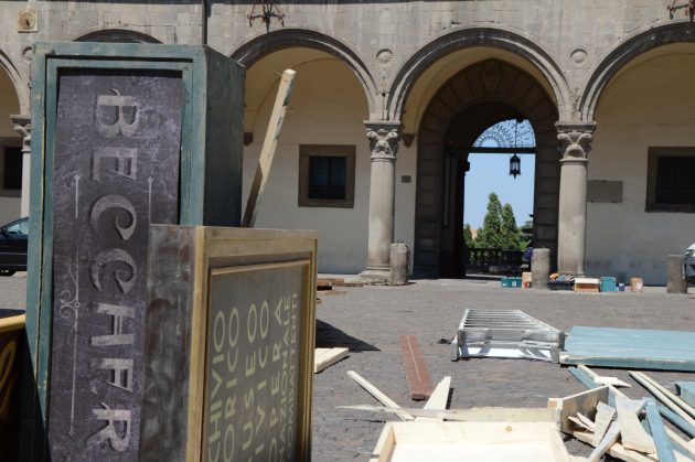 Arrivando in centro, i cartelli indicano “location”: il set? Per di qua. Di buon mattino, racconta una barista, sono arrivati tir d’auto d’epoca e carri armati. Piano piano, sulle vetrine dei negozi del centro compaiono insegne d’epoca: il banco dei pegni, la vetreria, la bottega del vinaio e la beccheria per comprare il tabacco. Viterbo, 1944. La città medioevale cambia volto per ospitare il set della miniserie di George Clooney, Catch-22, adattamento del romanzo di Joseph Heller (per noi, Comma 22). C’è praticamente tutto, dai mezzi militari ai sacchi di sabbia, manca solo lui, George Clooney: il primo ciak domani mattina, intanto la città torna indietro nel tempo, alla seconda guerra mondiale. Clooney – che ha scritto e coprodotto la serie, girando anche un paio di episodi – interpreta nel personaggio del il Colonnello Scheisskopf (e non il colonnello Cathcart, come si era detto in un primo momento) responsabile dell’addestramento che darà filo da torcere a John Yossarian, aviatore dell’aeronautica militare che vorrebbe essere esonerato, ma non ci riesce per via di un cavillo, il comma 22.