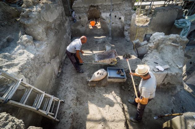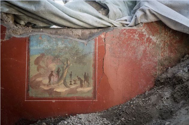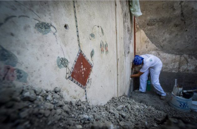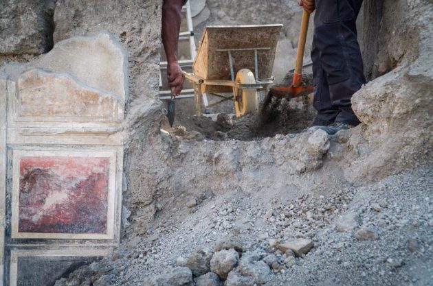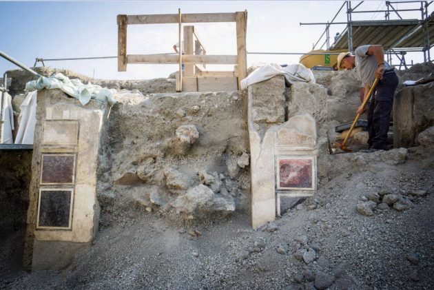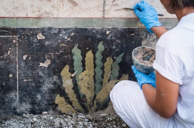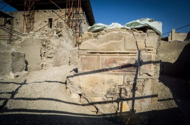 A Pompei gli scavi restituiscono nuovi tesori e riscrivono, in questo modo, la storia della “Casa di Giove“. La domus continua a delinearsi nella sua struttura completa, con affreschi preziosi, oggetti e tracce di vita quotidiana. Il cantiere della Regio V degli scavi ha svelato infatti una serie di ambiente decorati in Primo stile, con riquadri di stucco imitanti lastre marmoree dipinte di vivaci colori (rosso, nero, giallo, verde) e, conservata in alcuni punti della parte superiore, un’imponente cornice di stucco con modanature dentellate.