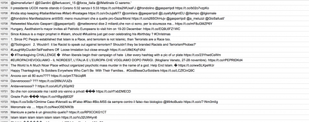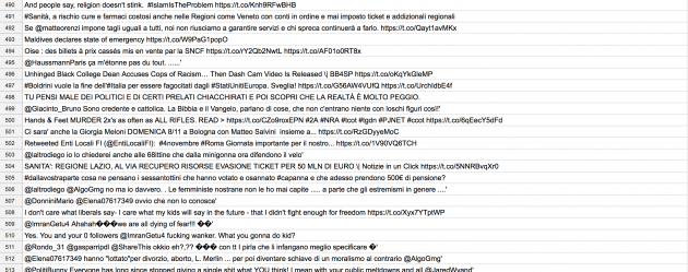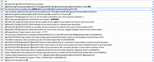 “Crediamo che questo account sia un vero e proprio account umano e non un troll russo – hanno spiegato i due studiosi – . Questo per tre motivi: 1. il tasso di tweet è molto alto. I nostri account di troll twittano molto, ma non tanto quanto questo, 2. Si può notare, seguendo il comportamento dei tweet ogni ora, che questo utente interrompe il tweeting quando dorme. I troll dell’Ira hanno una giornata lavorativa di 12 ore. 3. Questo utente twitta sia in inglese che in italiano. I troll russi dell’Ira tendono ad attenersi a una lingua”.