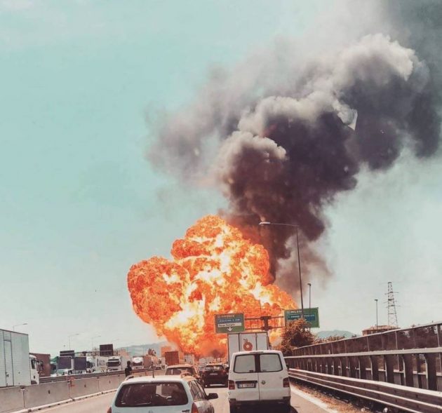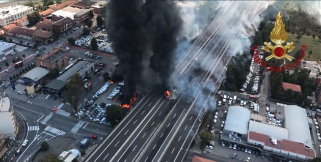 Una fila di tir in coda, un’autocisterna che non si accorge del rallentamento e non frena: tampona l’ultimo camion, si incendia e dopo poco esplode. Da quel momento si scatenano una serie di scoppi a catena: il mezzo infatti trasportava gpl. È quello che è successo sul raccordo autostradale che collega l’A1 e l’A14 all’altezza di Borgo Panigale, alle porte di Bologna: le fiamme hanno coinvolto i veicoli di alcune concessionarie presenti nelle vicinanze che sono a loro volta esplose. Poco dopo è parzialmente crollato il ponte che passa sopra la via Emilia. Almeno una la persona morta – cioè l’autista dell’autocisterna – mentre i feriti sono 145, quattro dei quali in modo grave, anche se non sono in pericolo di vita. Alcuni sono stati colpiti da schegge e detriti, altri hanno riportato pesanti ustioni su varie parti del corpo. Fra le persone coinvolte nello scoppio 11 carabinieri e due poliziotti della stradale che stavano dirigendo il traffico dopo un precedente scontro. In un primo momento si era parlato di due morti, ma la prefettura ha comunicato che in realtà la vittima accertata è soltanto una: le ricerche, però, non sono ancora concluse.