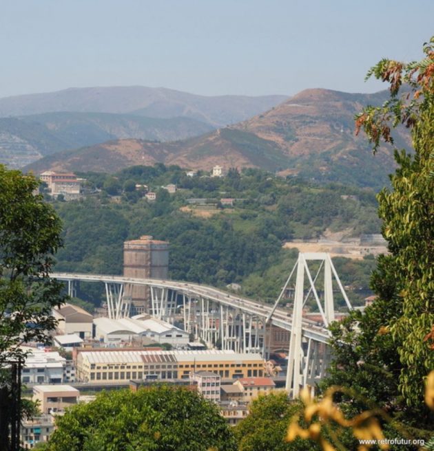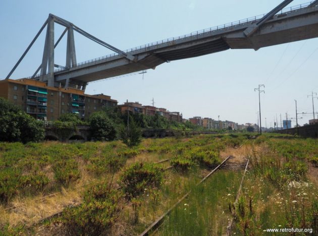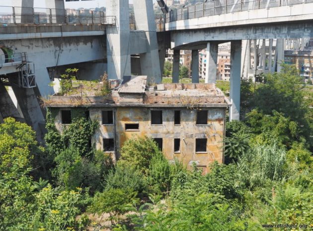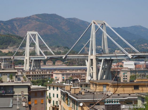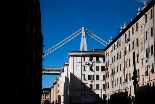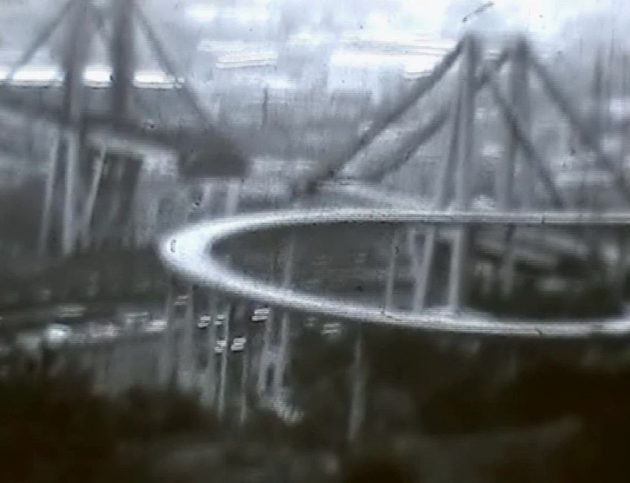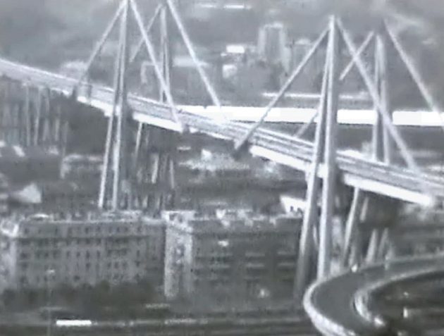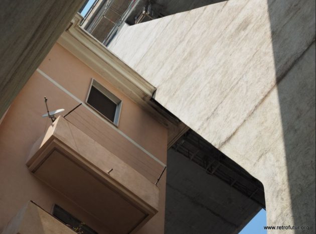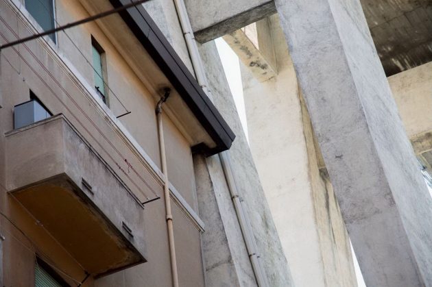 Nei frame catturati da un filmato storico, quelle case erano già lì nel 1963 quando sono iniziati i lavori del Ponte Morandi di Genova, crollato il 14 agosto 2018. Un ponte definito all’avanguardia ma fragile, bisognoso di continue manutenzioni. Nel clima ottimista degli anni Sessanta, del boom economico, però, tutto sembrava possibile per la tecnologia e la creatività italiana. Anche costruire a pochi centimetri dai tetti. Le finestre ancora aperte e i panni lasciati stesi per fuggire dal possibile crollo di quello che resta del “ponte Brooklyn” di Genova, fanno da cornice alle grondaie dei palazzi di via Walter Fillak che rasentano i pilastri. Le case sembrano intagliate per far posto ai sostegni del viadotto. Così negli scatti fa effetto vedere il ponte interrotto, che ha spaccato in due Genova, incombere sugli edifici sottostanti. Ma sono ancora più impressionanti le immagini della struttura prima del fatidico 14 agosto, quando quel “poggiare” sui tetti delle case, appare “normale”.