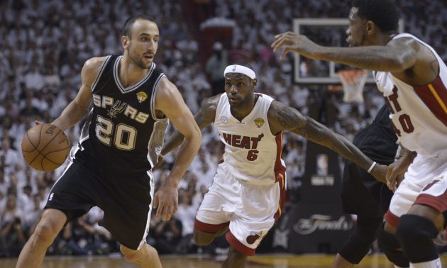 La stagione 2002/2003 vede l’allunaggio di Ginobili in Nba. Nonostante le fiammeggianti prestazioni dell’argentino ai Mondiali di Indianapolis, la superficie dell’universo americano si rivela però assai più ostica di quanto preventivato per il genio mancino. Limitato dall’iniziale repulsione per la rigida disciplina di coach Gregg Popovich, deus ex machina della franchigia texana, Manu riesce a ritagliarsi poco più di una ventina di minuti a partita. Eppure, anche se subentrando dalla panchina, El narigon ha di che festeggiare a fine anno, con texani in canotta nerargento che si aggiudicano il secondo anello della propria storia e con il compagno Tim Duncan che solleva il trofeo di Mvp delle Finals. Da qui in poi si fa la storia. Con la diffidenza nei confronti di Popovich che va ad appianarsi e con la guardia argentina pronta a battezzare una vera e propria dinasty. Finalmente libero di coltivare il proprio estro all’interno di un sistema che affida a lui e al playmaker francese Tony Parker la propria fonte principe di fantasia, infatti, Ginobili illumina il firmamento Nba, collezionando altri tre titoli (2005, 2007 e 2014) e incrementando l’argenteria di casa con un premio di Sesto uomo dell’anno e un paio di convocazioni all’All Star Game. Le giocate memorabili per astuzia, bellezza e intelligenza cestistica? Non si contano.