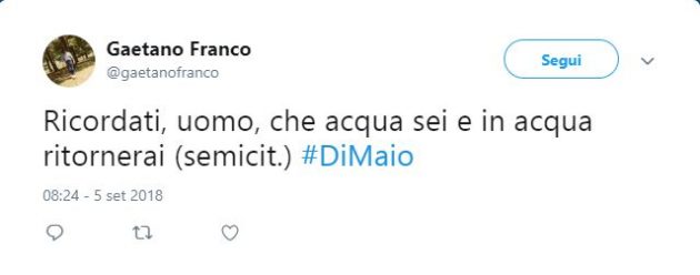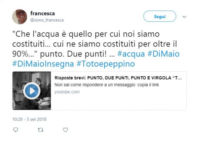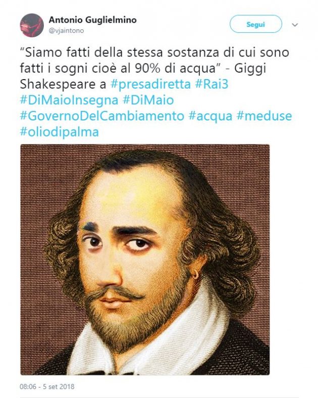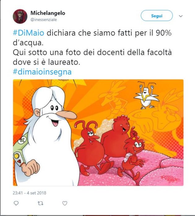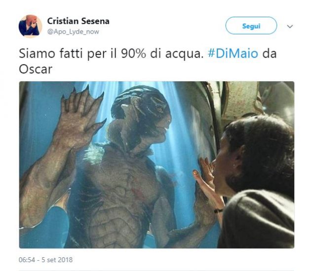 “L’obiettivo del ritorno all’acqua pubblica è anche un tema culturale del Paese, perché l’acqua è quello di cui noi siamo costituiti per oltre il 90%“, così il ministro del Lavoro e dello Sviluppo Economico Luigi Di Maio alla trasmissione Presa Diretta su Rai3. Il vicepremier è intervenuto, intervistato da Riccardo Iacona, sul problema delle reti idriche italiane e la sua gaffe non è passata inosservata. Gli utenti dei social network, in particolar modo di Twitter, si sono lasciati andare all’ironia, ricordando poi a Di Maio che un uomo adulto, in media, è composto al 60% d’acqua. E c’è chi ricorda che anche un verso degli Afterhours – Pop – Manuel Agnelli commette lo stesso errore del vicepremier e recita “Che al 90% anche noi siam fatti d’acqua”.