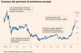 Torna a salire il prezzo dei crediti di carbonio sul mercato europeo dei permessi di emissione, il più importante al mondo. È una buona notizia perché è un modo per indurre spostamenti su larga scala verso l’utilizzo di gas naturale e fonti rinnovabili.