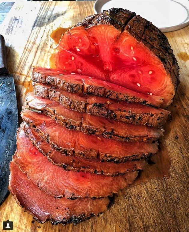 Sembra proprio il classico arrosto al forno. Sul tagliere pronto per essere affettato, ben abbrustolito fuori, tenero e succulento, un po’ al sangue, dentro. Con tanto di foglie di rosmarino sopra. A vedere come si affetta facilmente fa venire l’acquolina in bocca. Un nuovo prelibato taglio di carne? Nient’affatto. È anguria affumicata. O meglio, il prosciutto di anguria affumicata di Duck’s Eatery, un ristorante nell’East Village di New York. Questo curioso cibo è l’ultima invenzione dello chef Will Horowitz e ha letteralmente conquistato la Grande Mela. Sia nel suo aspetto esteriore che quando viene affettato infatti, lo “smoked watermelon ham” assomiglia incredibilmente alla carne tanto che il video mentre viene affettato è diventato virale sul web, con più di 100 milioni di visualizzazioni in pochi giorni. Roba da mettere in crisi carnivori e vegetariani.