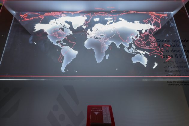 Per avere immediata percezione del divario tra Nord e Sud del mondo, basta premere un pulsante e un planisfero sulla parete ridisegna i confini dei continenti in base al Pil: l’Africa diventa una sagoma striminzita, con solo il 3% del Pil globale, nonostante ospiti il 17% della popolazione di tutto il mondo. Al centro della sala, tavoli luminosi che si attivano con un tocco della mano, mappe che si accendono e si colorano per mostrare l’aumento di popolazione dei vari continenti, ad esempio, o il tasso di persone che non hanno accesso all’acqua potabile. Il planisfero diventa blu, come l’acqua, e poi a chiazze, per mostrare che la ricchezza liquida è accessibile a più del 90% dei cittadini di America ed Europa e solo al 40% di quelli dell’Africa subsahariana, dove sei persone su dieci sono costrette a bere acqua contaminata.
